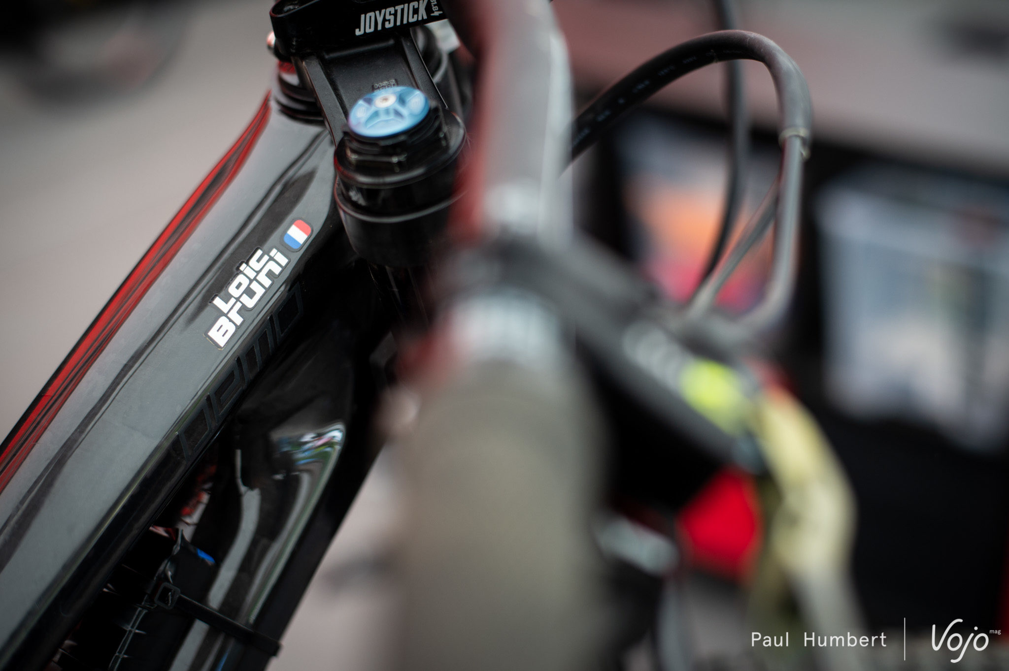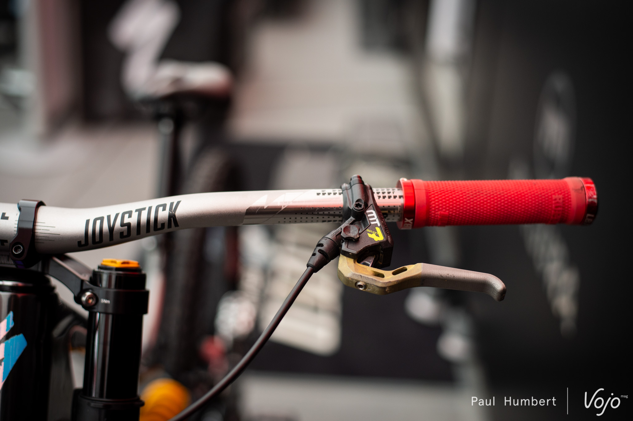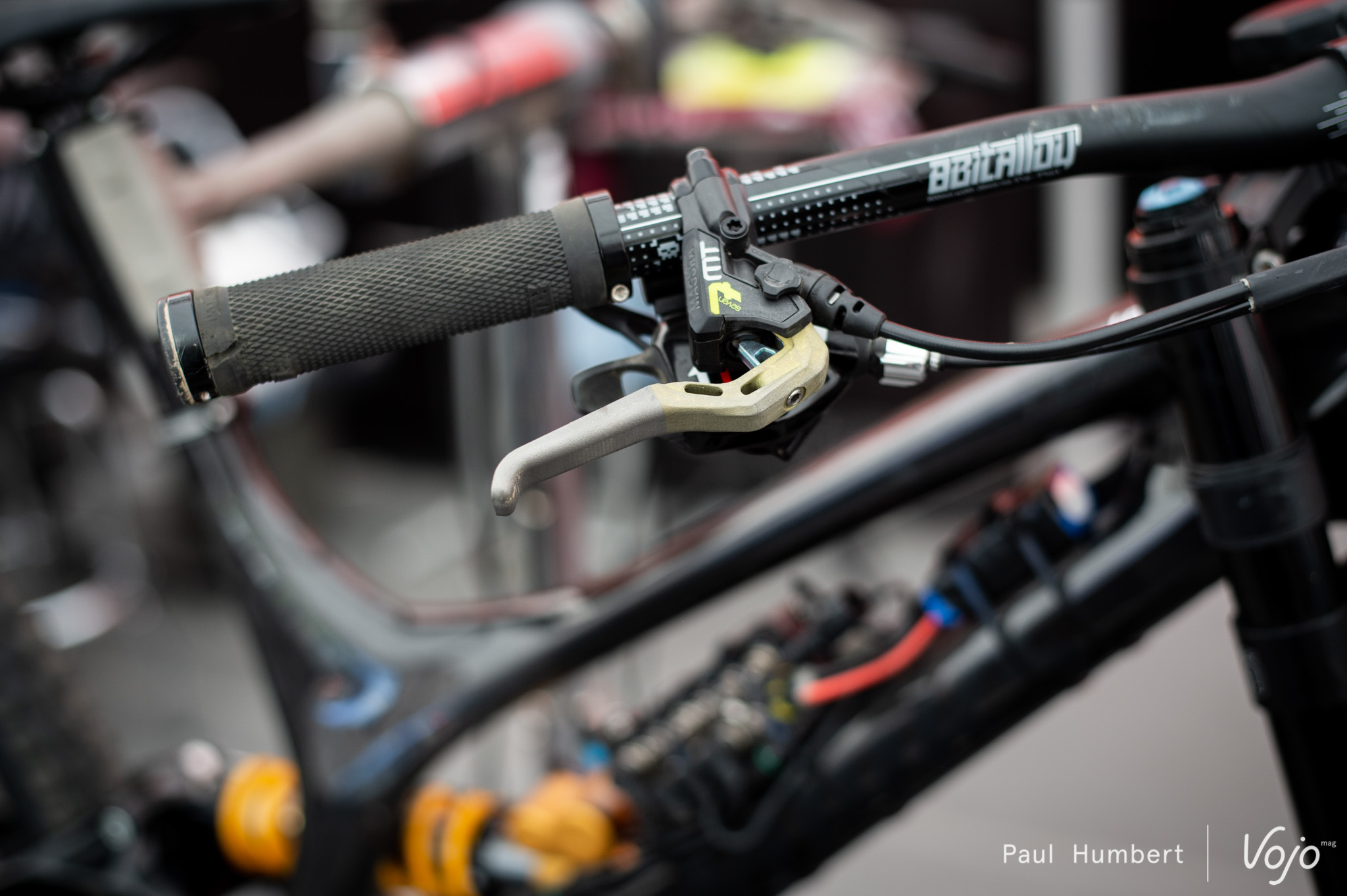 Là où notre intérêt s’éveille, c’est quand nous découvrons des leviers de frein en titane sur le vélo de Loïc Bruni.