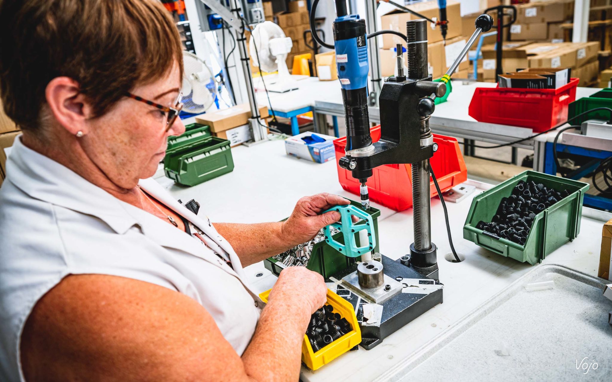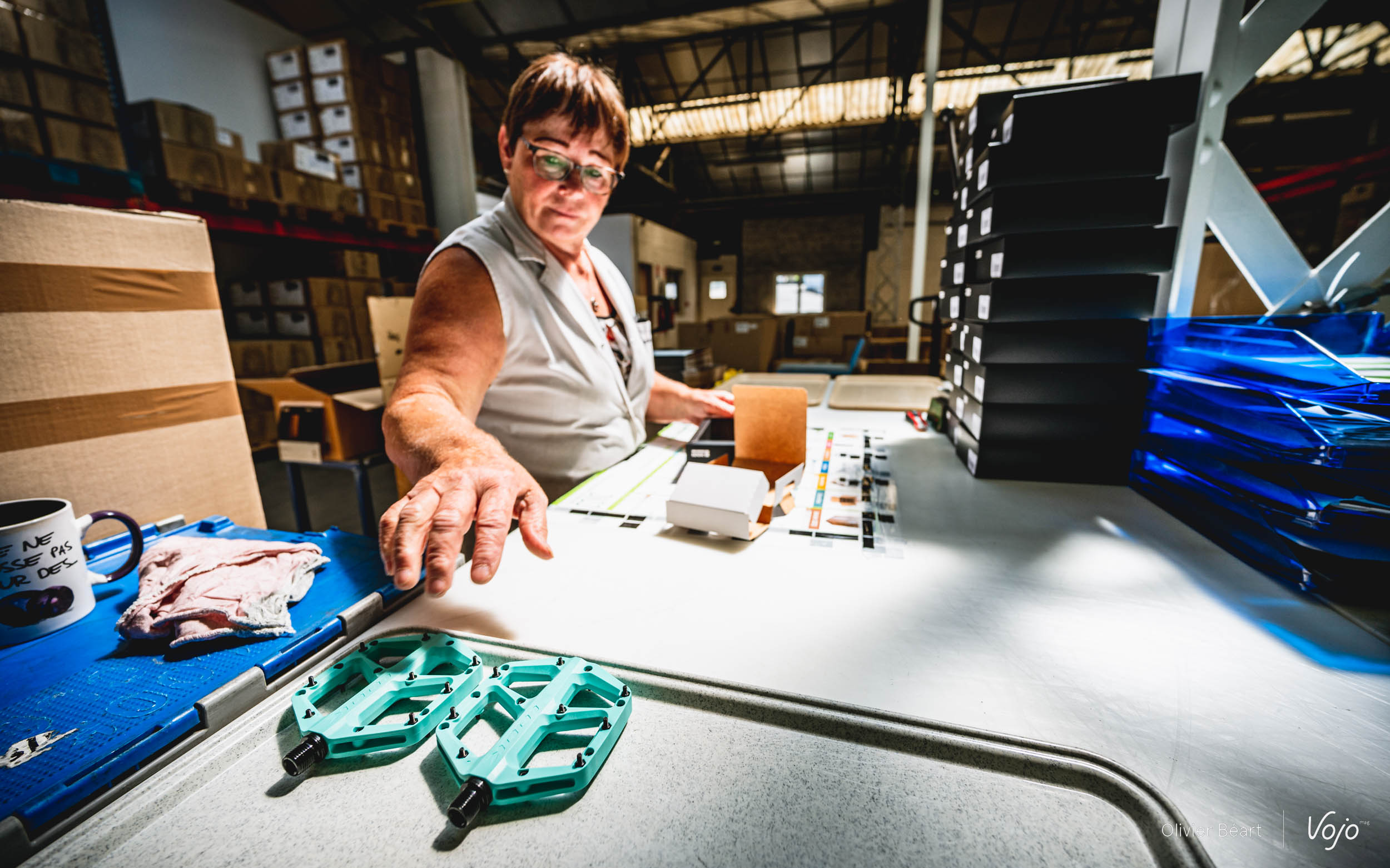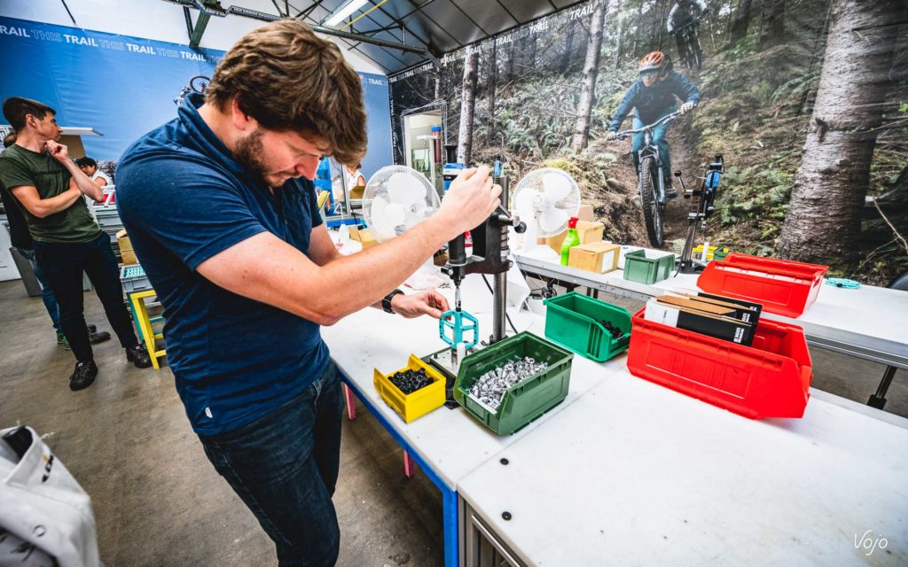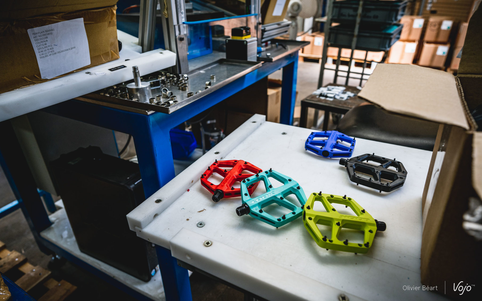 Ce n’est pas la Trail Roc+ que je vais monter car elle n’est pas encore entrée en production, mais une paire de Trail Fusion, le modèle d’entrée de gamme qui fait lui aussi son apparition au catalogue. Face à moi, il y a deux lignes, une pour les pédales gauche, et une autre en face pour les pédales droite. Un moyen simple et efficace pour éviter les confusions. Attentif, je regarde les mains expertes de Martine prendre axe, roulements, écrous et assembler le tout en moins de temps qu’il n’en faut pour l’écrire !
