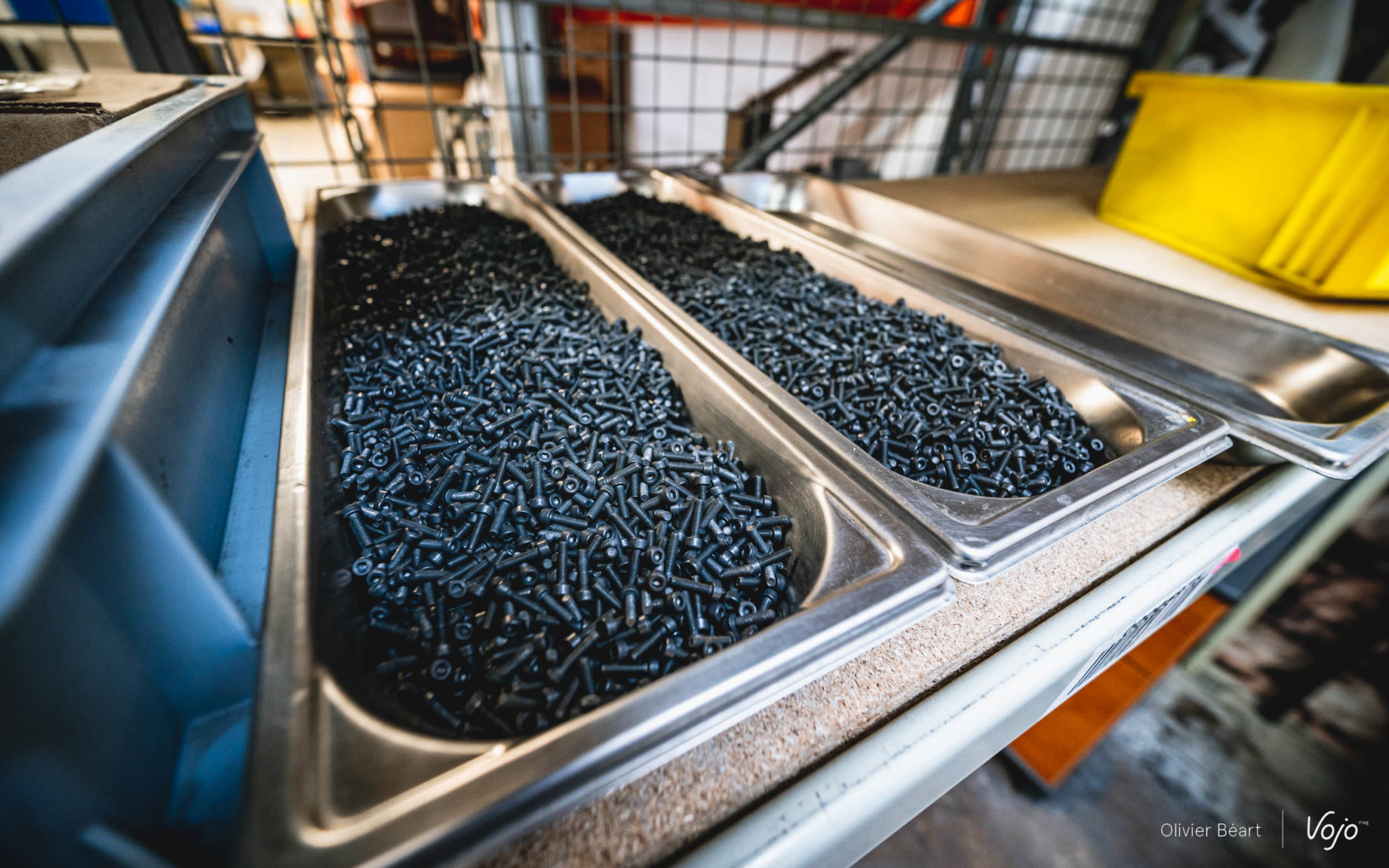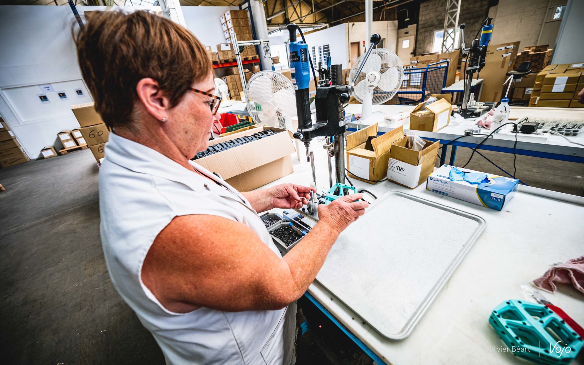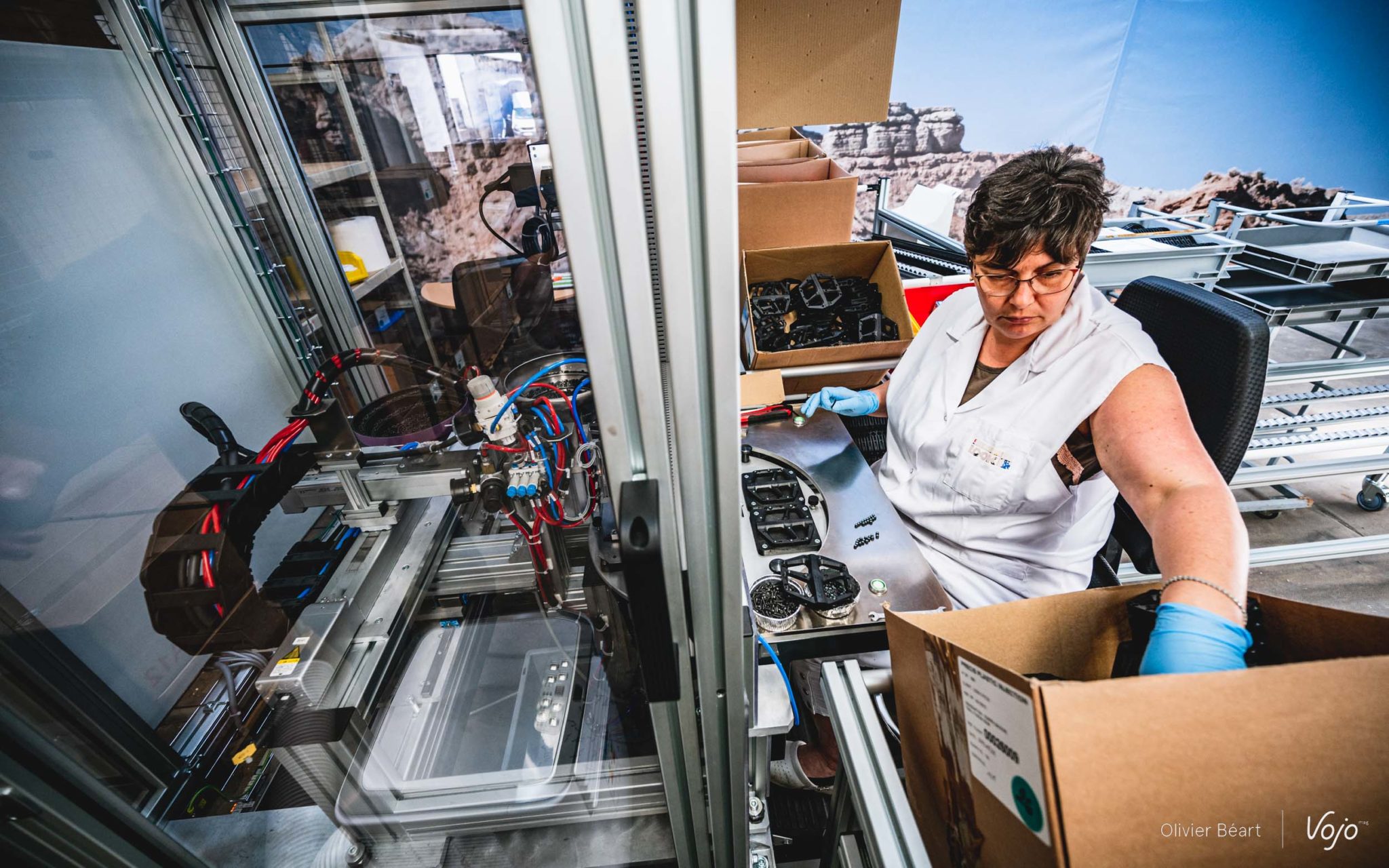 Ce n’est pas la Trail Roc+ que je vais monter car elle n’est pas encore entrée en production, mais une paire de Trail Fusion, le modèle d’entrée de gamme qui fait lui aussi son apparition au catalogue. Face à moi, il y a deux lignes, une pour les pédales gauche, et une autre en face pour les pédales droite. Un moyen simple et efficace pour éviter les confusions. Attentif, je regarde les mains expertes de Martine prendre axe, roulements, écrous et assembler le tout en moins de temps qu’il n’en faut pour l’écrire !