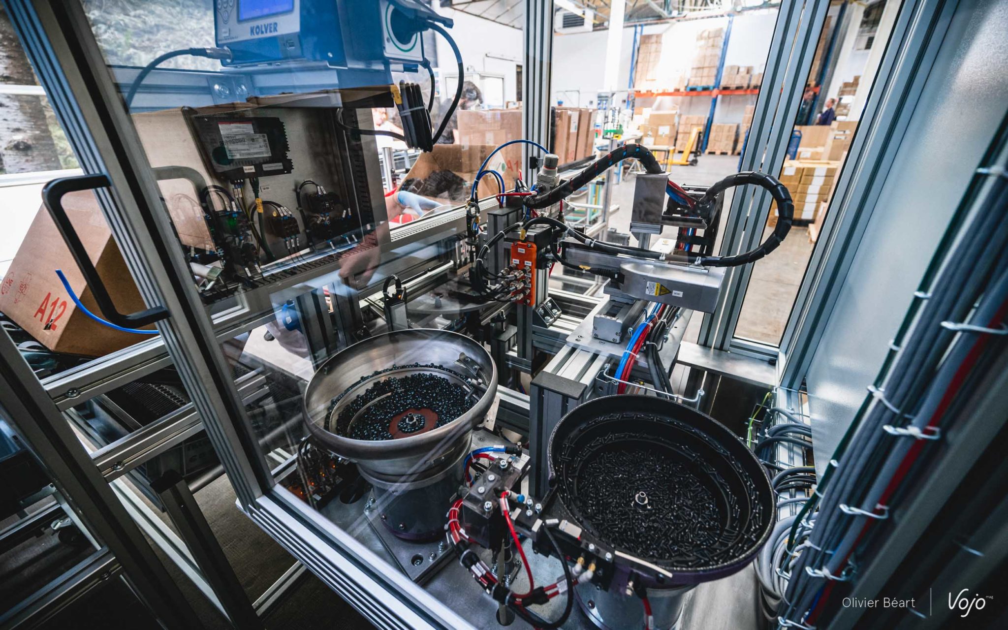 Si, globalement, le processus d’assemblage est le même que pour une pédale automatique en ce qui concerne le montage de l’axe sur la plateforme, il y a tout de même ici une étape spécifique avec la mise en place des petites vis servant de picots sur chaque pédale. Pour cela, une machine spécifique a été mise au point par Look afin de « semi-automatiser » le processus. L’opératrice reçoit le nombre correct de vis face à elle de la part de la machine, elle n’a plus qu’à les glisser dans des alvéoles qui les mettent directement bien en place pour le vissage, effectué automatiquement par la machine. Un contrôle visuel et hop c’est parti pour la suite.