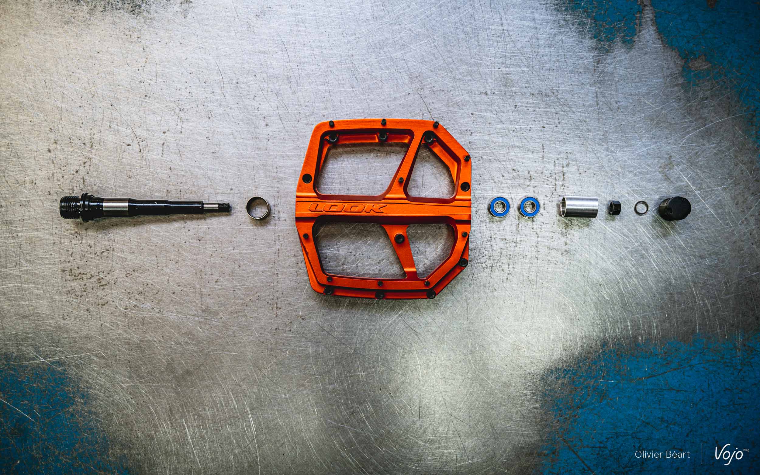 Pour l’axe, les bases techniques ont été assez rapidement posées et Look a profité de ses trente années d’expérience en la matière. Même si, dans le cas qui nous occupe, il fallait maximiser la résistance aux impacts, notamment pour les réceptions de sauts et les chocs, nombreux dans la pratique gravity. Le choix a été fait de mettre deux roulements et une bague dans l’axe de la pédale, le plus possible à l’extérieur pour encaisser les efforts et garder une bonne fluidité.