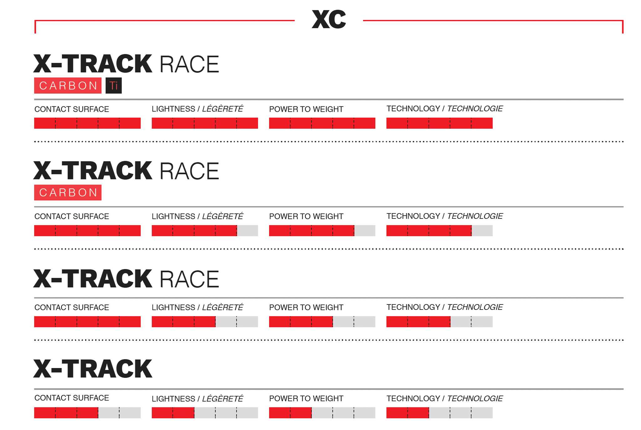 La nouvelle gamme X-Track se compose de quatre modèles. Look met bien évidemment en avant les caractéristiques de son modèle haut de gamme : la X-Track Race Carbon Ti.