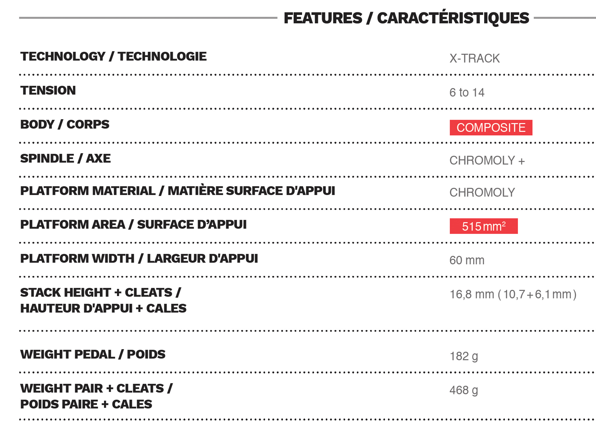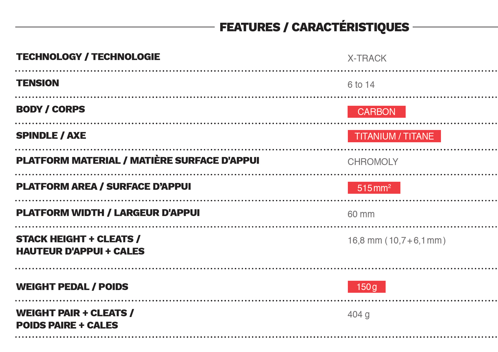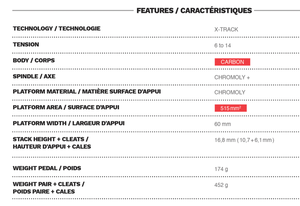 La X-Track Race Carbon Ti est le porte étendard de la gamme avec son corps en carbone et son axe en titane. On retrouve la surface d’appui de 515mm2 et les caractéristiques présentées plus haut. Elle se commercialisera à 199,90 euros pour un poids annoncé de 150g pièce (404g la paire avec les cales). Le poids est donc supérieur à celui des S-Track mais Look annonce toutefois une augmentation de la performance grâce à une plateforme de transfert de puissance plus grande. On reste néanmoins en-dessous du poids d’une Shimano XTR.