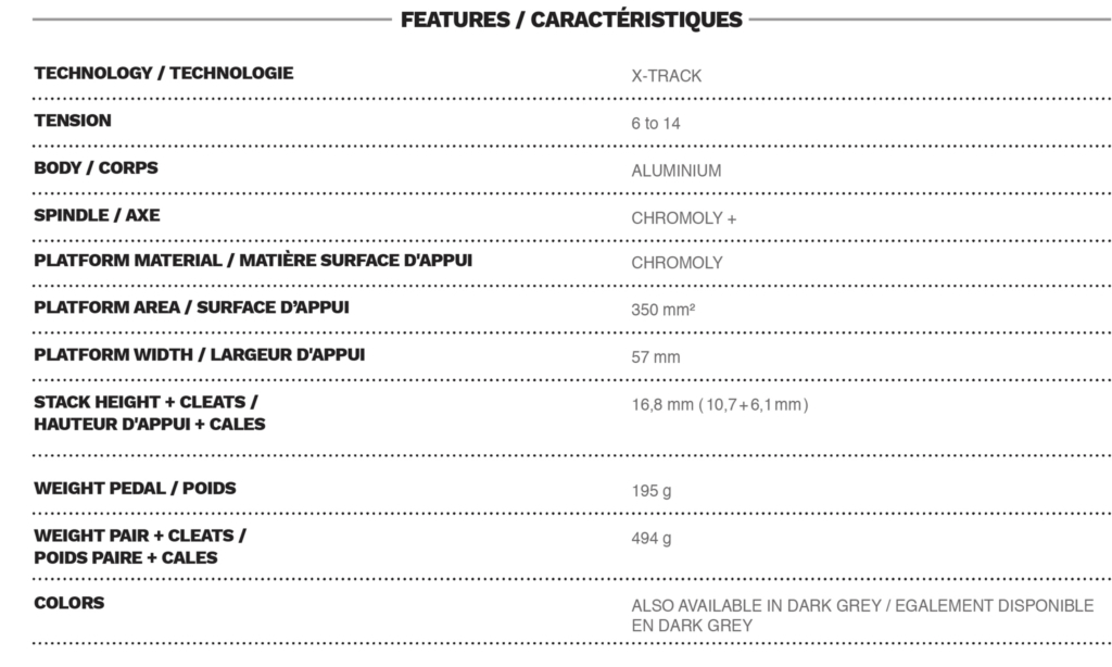 Enfin, la Look X-Track classique s’occupe de l’entrée de gamme. Son corps est en aluminium, l’axe en chromoly et si la pédale semble identique, sa surface d’appui diminue et n’offre plus que 350mm2. La pédale affiche 195 grammes (494g la paire avec les cales) pour un tarif très accessible de 49,90 euros.