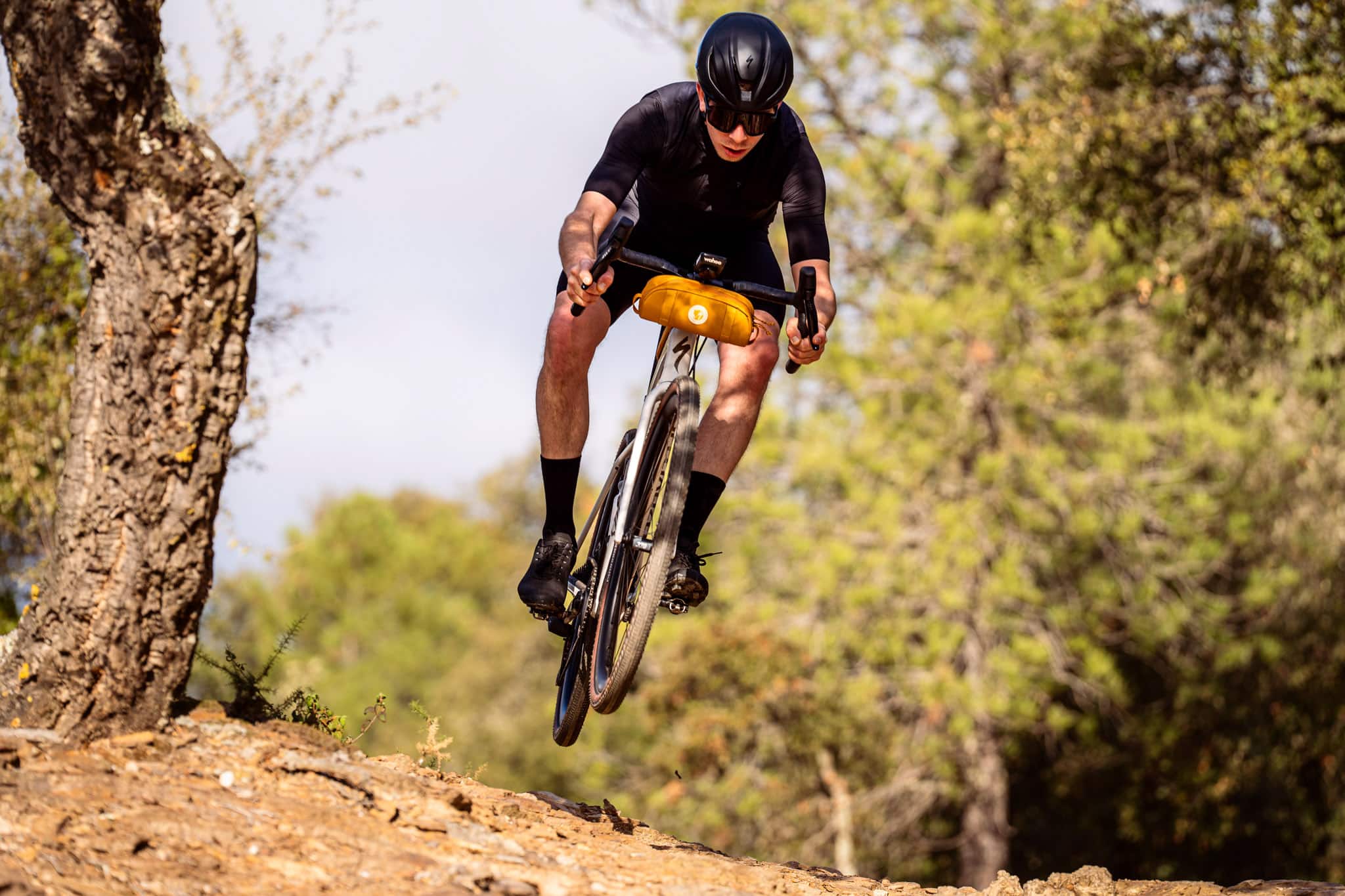 Petit détail qui pourrait paraître insignifiant, mais sur les gravel, j’aime les petites pochettes sur le tube supérieur, qui permettent de délester un peu les poches de maillots ou des vestes et d’accéder facilement à une barre énergétique salutaire.