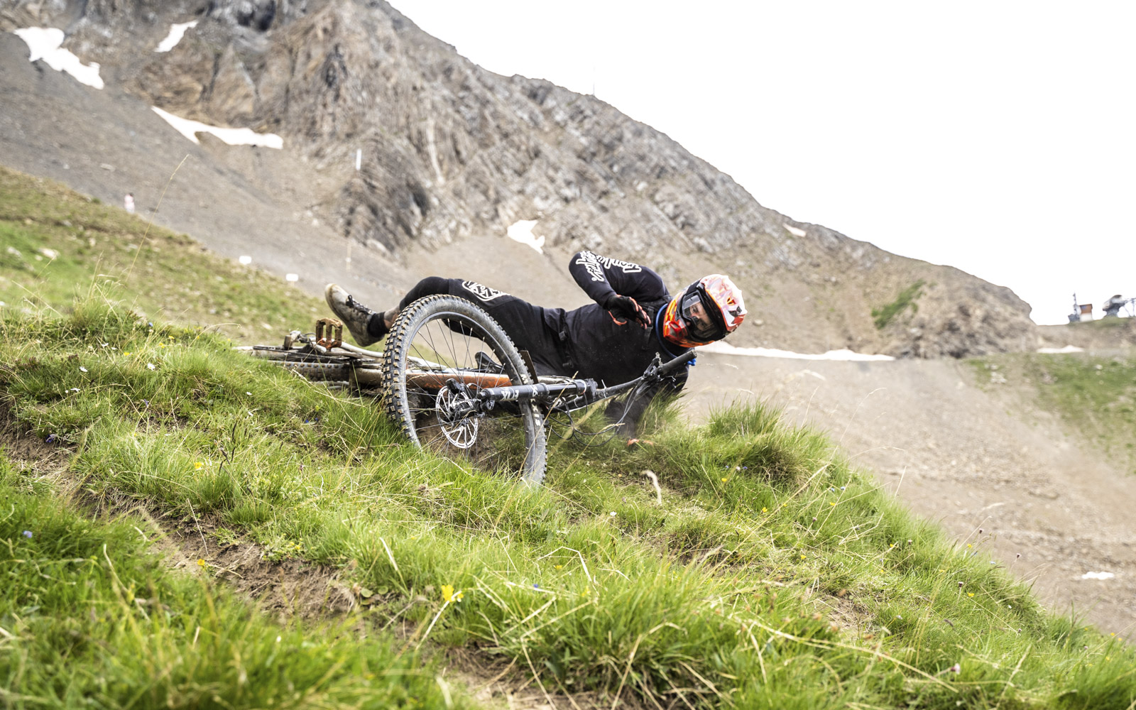 Devant moi, les choses se gâtent immédiatement. Je vois des corps glisser, des vélos voler et la piste est jonchée de chambres à air, de Go Pro et de masques ou de lunettes. Après 200 mètres, je vois quelqu’un qui marche avec son vélo à la main, la roue arrière cassée en quatre endroits.