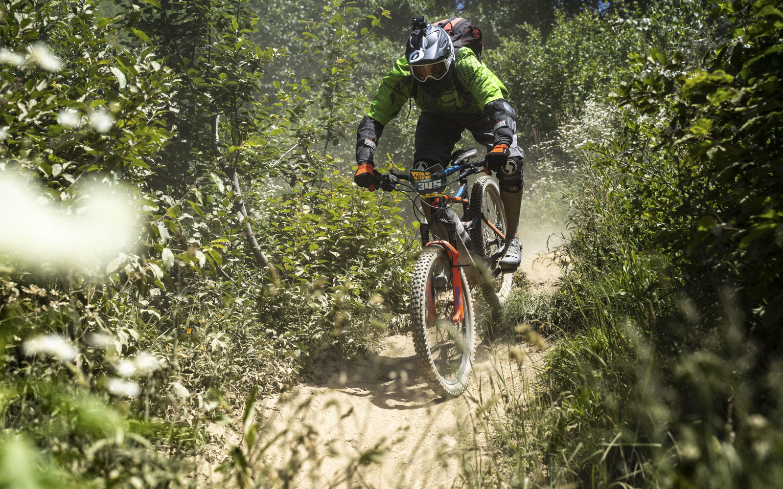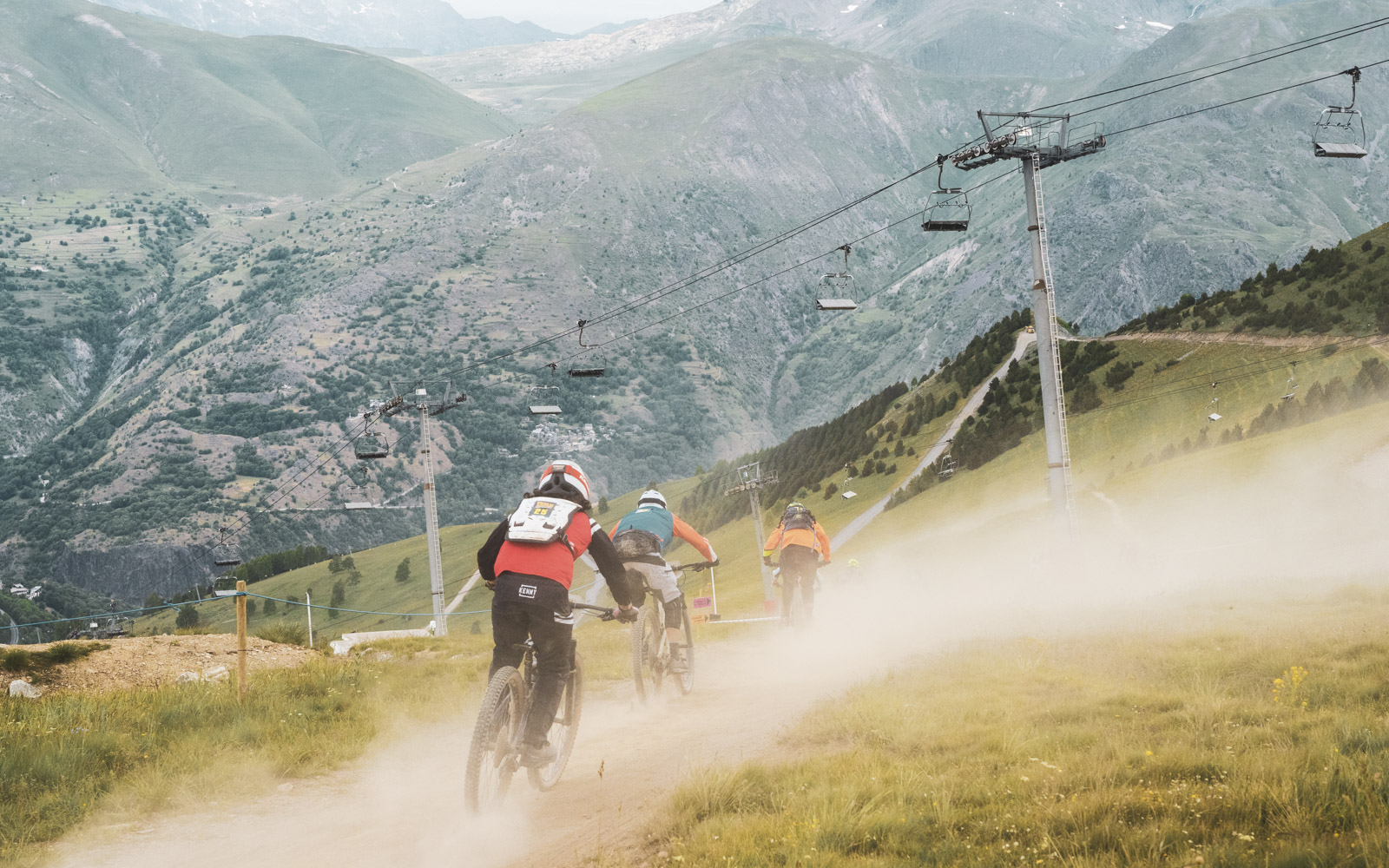 C’est chacun pour soi maintenant, la compétition est lancée, mais sur les singletracks, il n’est pas toujours facile de gagner une place. Sans faire attention, nous voyons les premières chutes ici et là, mais à chaque fois les pilotes se relèvent pour reprendre la course. Tout ce qui compte, c’est celui ou celle qui vous précède. Comme un taureau qui poursuit un chiffon rouge, on poursuit le ou la pilote qui roule juste devant.