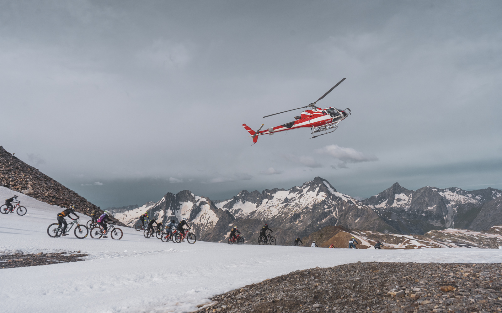 L’hélicoptère fait plusieurs fois le tour du champ des participants et je réalise que c’est le moment le plus surréaliste que j’ai jamais vécu. La foule devant moi commence à bouger et je cours aussi vers mon vélo et le pousse dans la neige jusqu’au départ. La course est lancée !