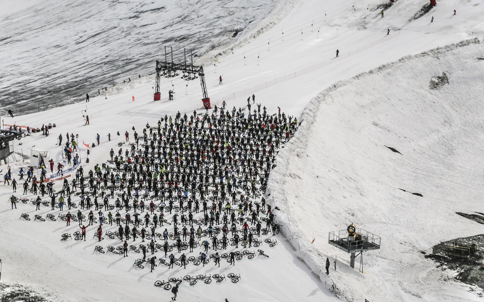 À neuf heures, sous un ciel clair, mon vélo est prêt sur la neige. Cela ne prend pas longtemps et devant moi, je vois une mer de cyclistes qui sautent et dansent sur la musique qui résonne au-dessus de la surface de la neige. Peu après, nous entendons à nouveau les premières notes de Highway To Hell, au même moment l’hélicoptère qui nous donnera le signal de départ nous survole. Nous nous préparons pour le départ en courant, une tradition que je connais de la course automobile au Mans.