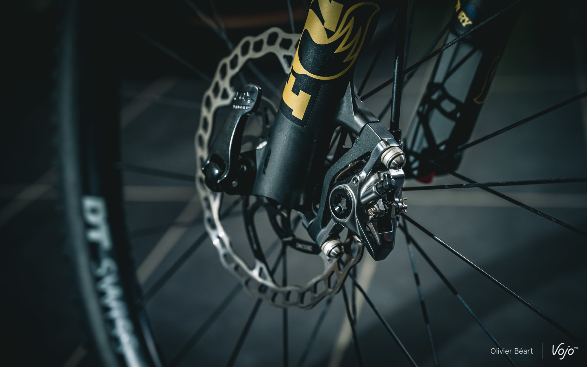 Côté freins, malgré son poids plume, Fred monte un disque en 180mm devant, sans hésiter, pour éviter l’échauffement dans les longues descentes de montagne.