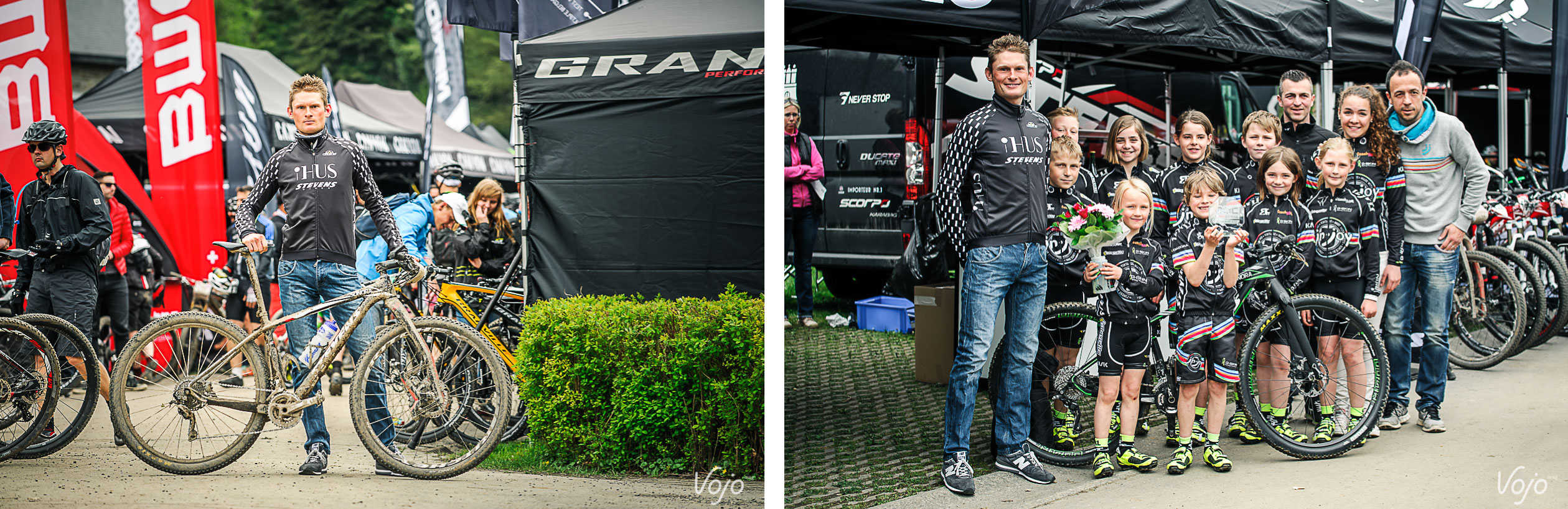 Juste avant la cérémonie protocolaire, on retrouve le vainqueur Soren Nissen, tout sourire en train de poser avec les jeunes du team belge 123VTT, également équipés par Stevens. Il nous explique « à 5km du but, Mennen a attaqué. Il était très fort. J’ai été le seul à pouvoir le suivre. Quand il en a remis une couche, je me suis accroché mais il a réussi à prendre 5 secondes d’avance. Puis, il a crevé. C’est aussi ça la course, et naturellement j’en ai profité. Comme j’habite non loin d’ici et que c’est la deuxième fois, c’est encore plus spécial pour moi de gagner cette année ! »