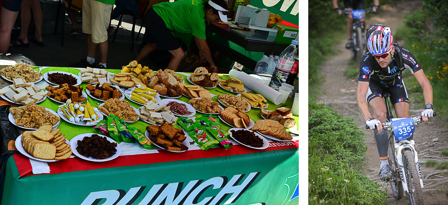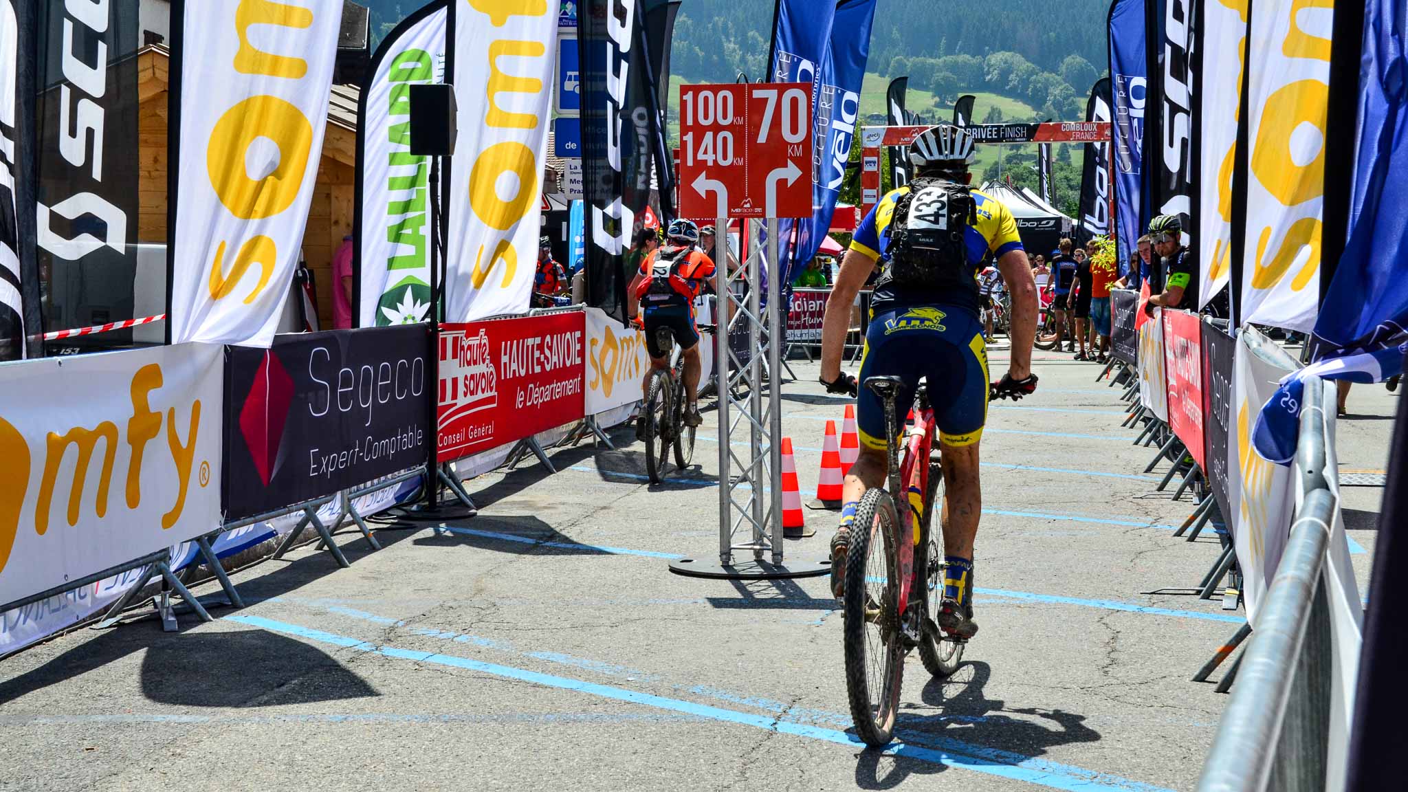 A la moitié de cette longue ascension, on profite du ravitaillement du Gâteau (ça ne s’invente pas). Son emplacement est stratégique car les bidons sont pratiquement vides et la plupart des concurrents s’y arrêtent pour faire le plein. Une fois passé la tête de la Torraz, le tracé nous balade sur la crête du Bonjournal, une succession de 4 coups de cul à la limite du roulable, et le dernier se négocie obligatoirement en poussant le vélo. Une fois le col du Jaillet atteint, nous plongeons sur Combloux via la piste d’enduro/DH du bike park. Un pur régal, mais qui nécessite de rester attentif, d’autant que le final comporte quelques portions droites très rapides qui mettent les freins à rude épreuve.