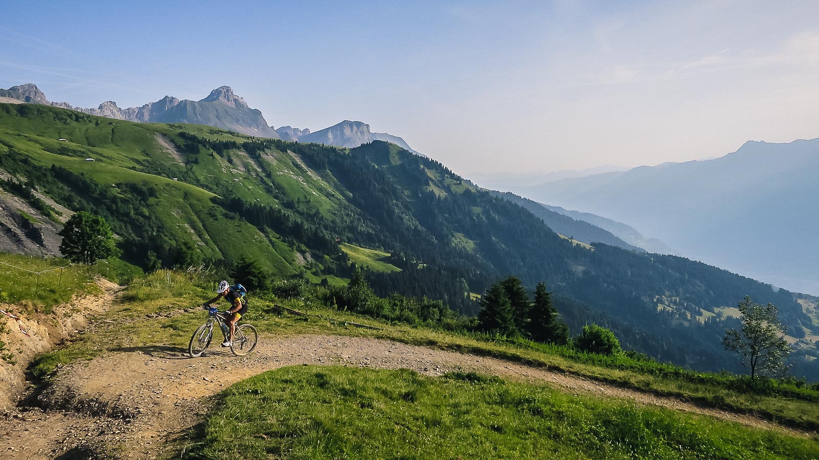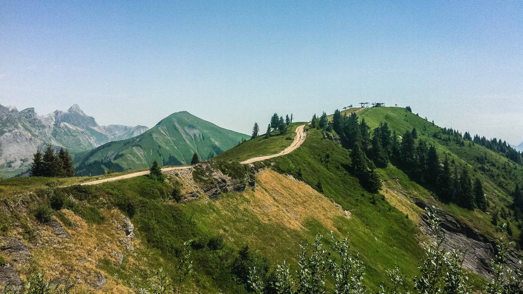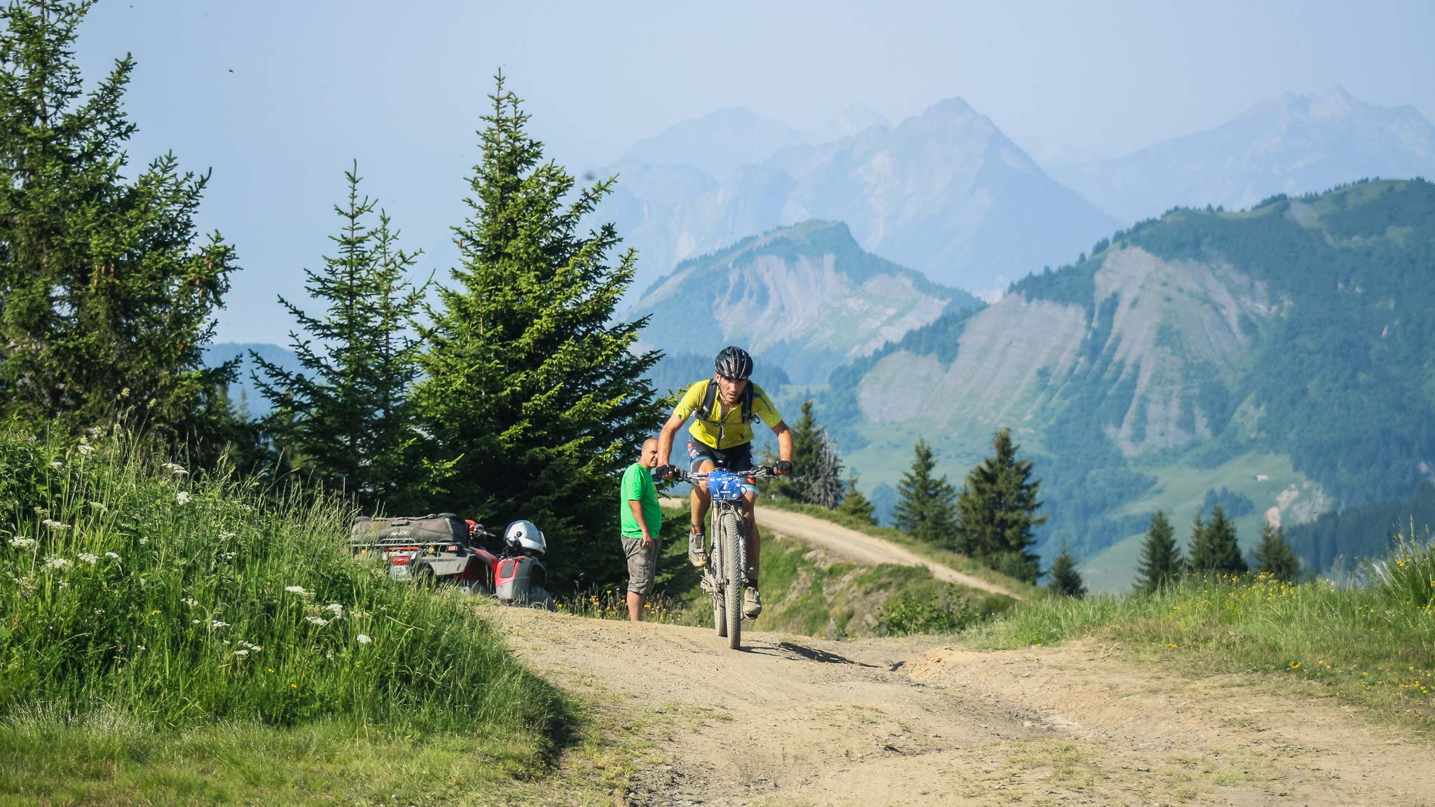 La descente depuis le col du Jaillet est un vrai régal avec une succession de passages techniques à travers les racines. Après 35 km nous profitons d’un bref arrêt à La Giettaz pour nous ravitailler. L’organisation y propose aussi un point d’assistance technique pour les plus malchanceux. Cette section descendante se termine par un passage très ludique en sous-bois, cela fait du bien d’être au frais et à l’ombre avant d’attaquer une très longue ascension sous le soleil. En effet, sur la MB Race, rares sont les montées qui se font à couvert. La plupart du temps, on n’a que son casque pour s’abriter…