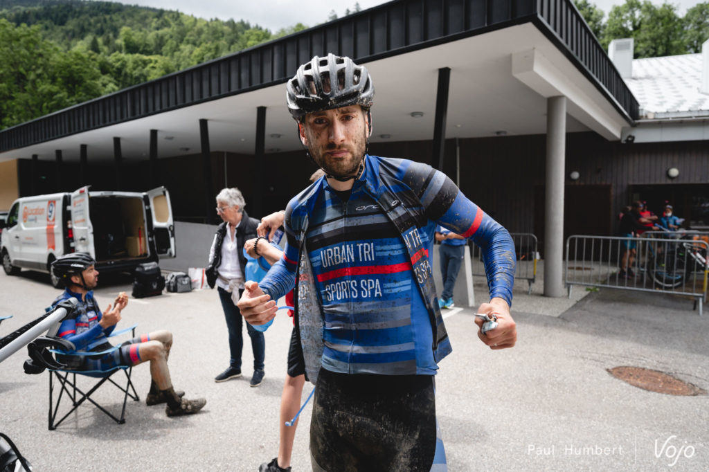 qu’on les déteste ou que personne ne finisse ? On est presque heureux de retrouver une descente sur asphalte juste après. Et surtout, on entame enfin la dernière montée ! Là, c’est comme si on revenait dans le monde réel, avec une plongée parmi les concurrents de l’Ultra. 115 km et 11 h de course pour eux ; 225 km et 30 h pour nous. On décompte le dénivelé mètre par mètre. Sur la fin, la pente devient folle et on pousse les vélos, mais la compagnie des participants de l’Ultra est précieuse. Là, c’est eux qui nous prennent pour des extraterrestres ! Un coureur suisse me prend même dans ses bras pour me féliciter d’être arrivé jusque-là. L’euphorie se mélange à la lassitude…. Le portage du Jaillet est toujours aussi usant et nous l’avalons en deux fois plus de temps que sur l’Ultra. Mais à ce stade le temps importe peu et ce qui compte, c’est que dans 30 minutes, nous serons finishers !