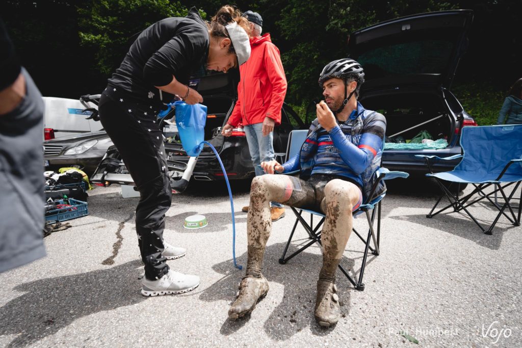 mais le ton est clair : c’est un examen des forces restantes ! Mon équipier Tom, anglophone, essaie de parler dans son meilleur français, mais la fatigue et la langue amènent une des membres du staff médical à devenir de plus en plus insistante sur la difficulté des 25-30km derniers kilomètres. Mais à ce stade, l’abandon n’est plus une option. On repart et, mauvaise surprise, les 1500 m de chemins qui devaient être roulants sont défonces par des engins de chantier et la boue. Du coup, on repousse le vélo sur du plat, en comptant le reste du dénivelé qui semble ne pas diminuer. Il ne reste pourtant « que » deux côtes, dont la dernière qui est la classique de la MB Ultra et son portage maudit. L’avant-dernière ressemble quant à elle à une dent de scie sur la carte, mais le début est très pentu et devient vite impossible à monter après 30 heures sur le vélo. Puis, c’est encore pire avec une section de racines à franchir vélo sur le dos. Le road-book nous aide à nouveau : il faut arriver sur une piste de ski et puis ça descend jusqu’à la dernière côte.