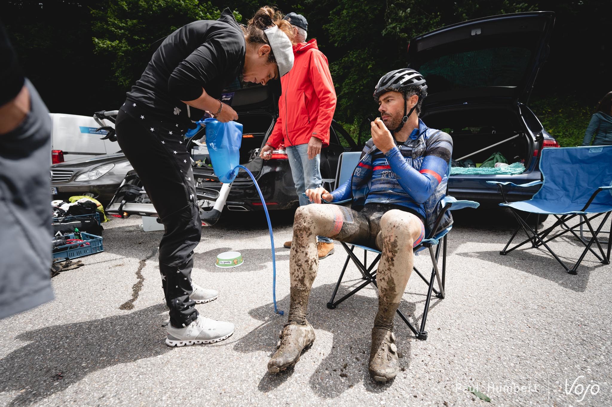 Pour y arriver nous avons 27km de montée (très peu de descentes). Une fois au-dessus du Col de Bisanne, nous empruntons des portions de l’UTMB pour redescendre sur les Saisies avec en prime un passage de 25 minutes dans des tourbières gorgées d’eau où il faut à nouveau marcher. Bref, on ne s’amuse pas du tout et les questions fusent dans nos têtes : la dangerosité de certaines descentes en vaut elle la peine ? La balance entre le plaisir et les risques pris n’a-t-elle pas basculé du côté risque ? Le ratio portage/roulage n’est-il pas un peu exagéré ? Physiquement nous sommes encore bien, notre matos est au top et nos ravitailleurs aussi. Mais ce que nous appellerons notre « raison » fait que nous déciderons finalement de nous retirer avant d’avoir pris le risque de trop sur ce parcours un peu trop extrême à notre goût dans ces conditions.