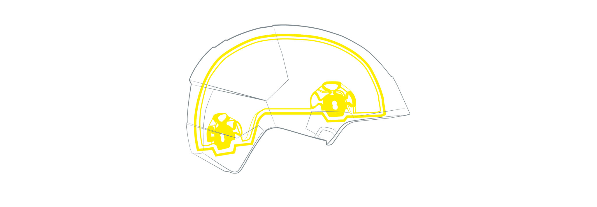 Le principe du MIPS est similaire à celui de notre cuir chevelu : permettre à la coque du casque d’avoir une certaine liberté de mouvement (10-15 mm dans toutes les directions) vis-à-vis de notre tête. Cela permettrait de réduire l’impact des accélérations angulaires. Suivant les variantes, le MIPS prend généralement la forme d’un liner transparent (anciennement jaune) ou d’élastiques jaunes entre le système de serrage et la coque en EPS.