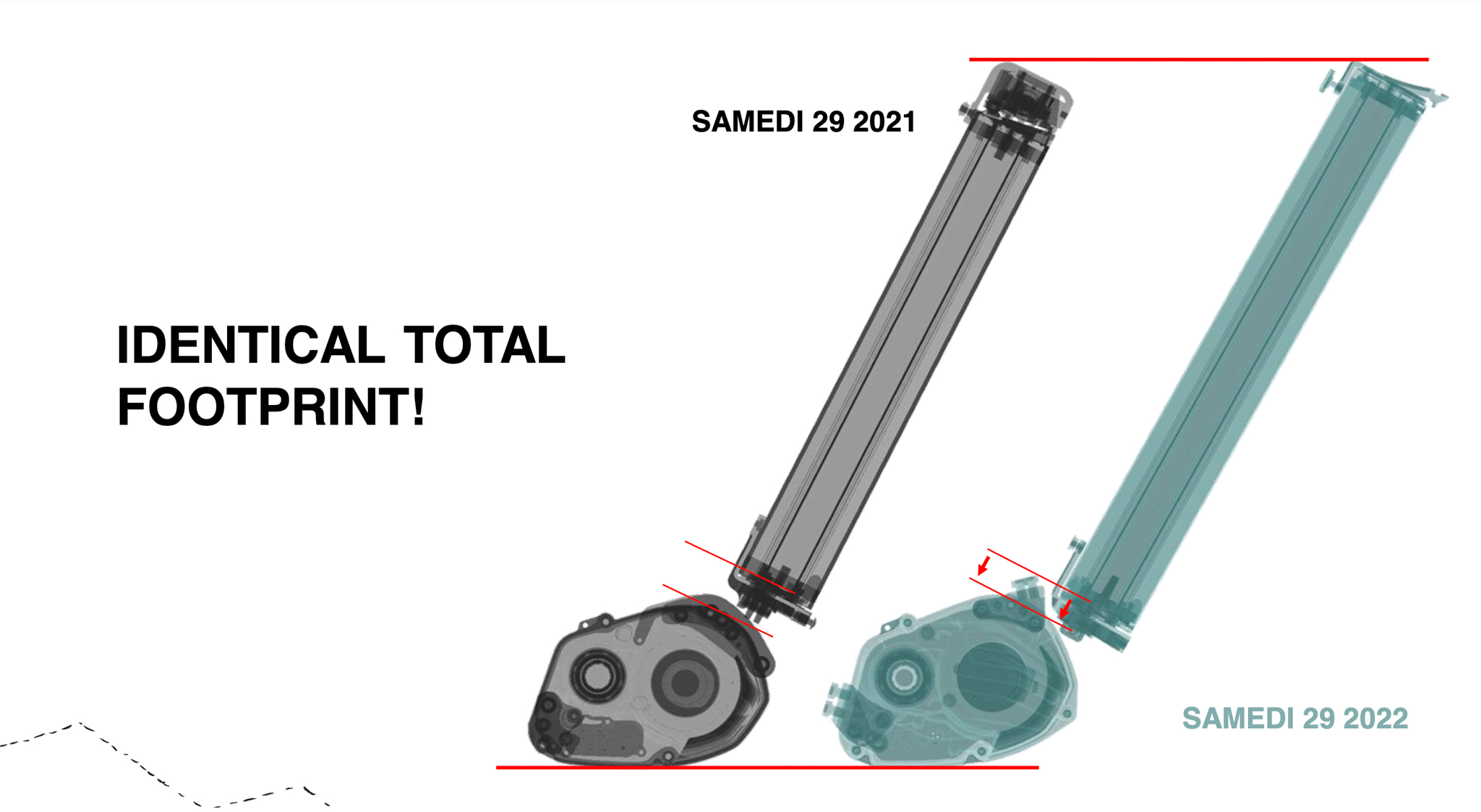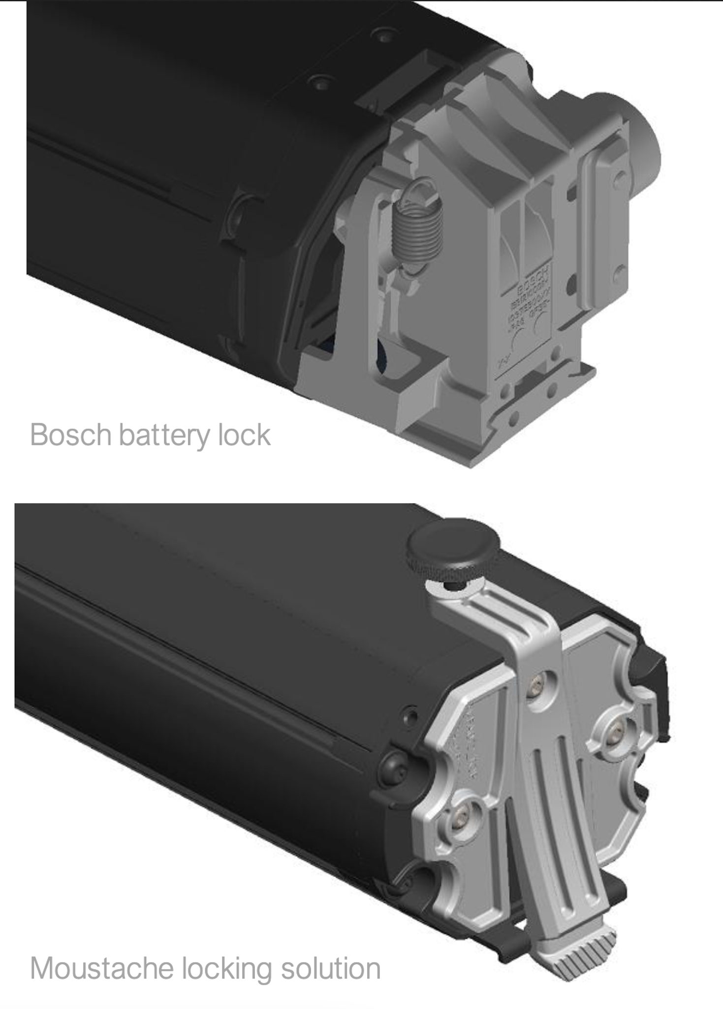 La réponse se complète en découvrant à quelles conditions cette nouvelle batterie a été intégrée. Du côté de l’interface batterie-moteur, la pièce de connexion a été redessinée par la marque vosgienne. Elle s’affine considérablement (-25mm) et permet ainsi de gagner de la place. Une des fiertés de Moustache est d’avoir réussi à intégrer cette nouvelle grosse batterie sur ses 4 tailles, tout en proposant un design de cadre encore plus « bas ».