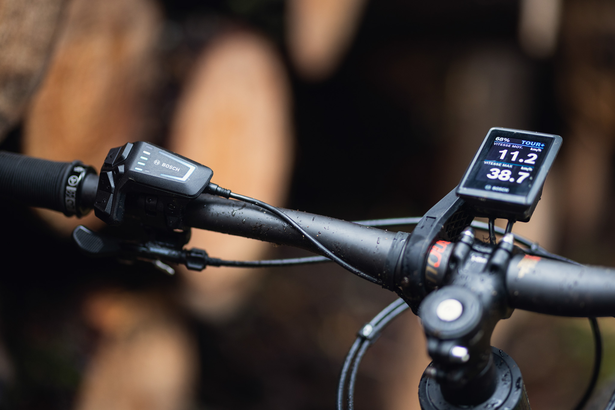 Dernier élément, et pas des moindres, c’est tout l’écosystème Bosch Smart System qui accompagne l’arrivée d’une grosse batterie : il se compose d’un nouvel écran Kiox 300, d’une nouvelle commande très chargée en boutons, mais qui propose des leds bien utiles, et le moteur Performance CX se connecte également à l’application Bosch Ebike Flow. Les possibilités de tracking, de guidage ou de contrôle se développent. C’est trop pour une simple utilisation VTT, mais ce système étant décliné sur des vélos bien différents, tout le monde bénéficie de ces fonctionnalités. Vous pouvez retrouver notre présentation complète ici, et sachez que le système peut désormais embarquer Strava et Komoot. La dernière mise à jour de l’application permet également de bloquer son vélo à distance ou de bénéficier d’un système de guidage.