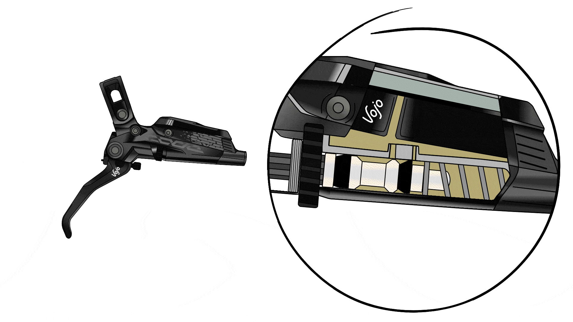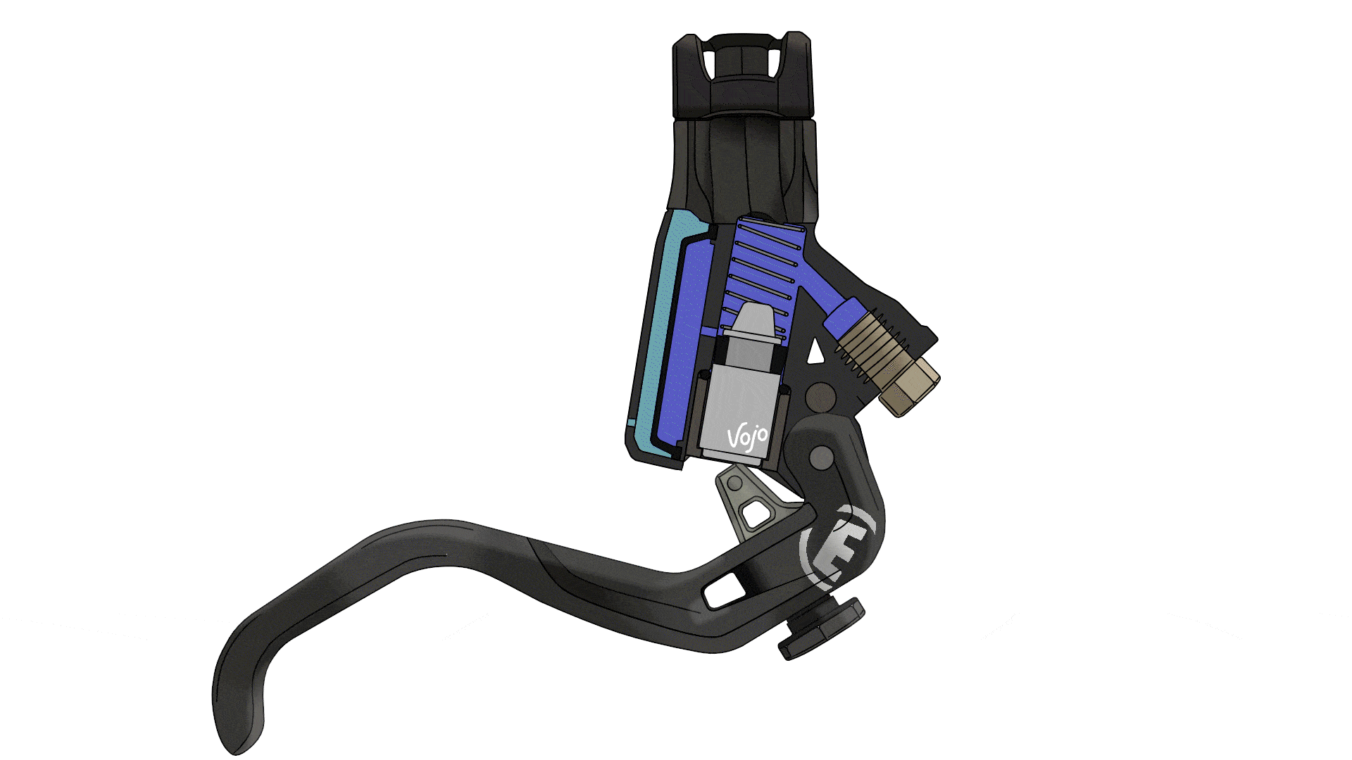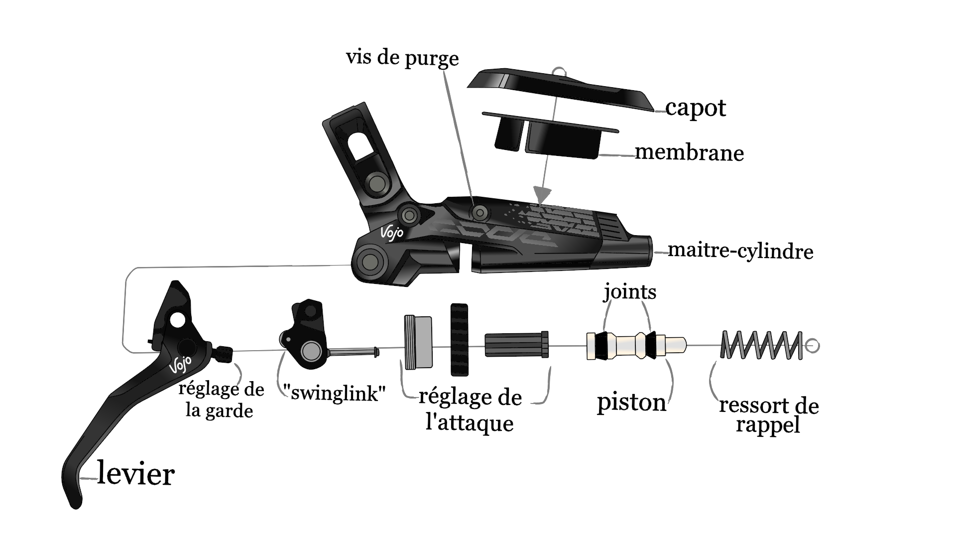 Le fonctionnement d’un maître-cylindre est simple. Lorsque l’on actionne le levier, celui-ci pivote autour de son axe, entraînant ainsi une pièce intermédiaire (baptisée swinglink chez Sram) qui vient pousser le piston. Ce dernier envoie ensuite l’huile vers l’étrier via la durite.