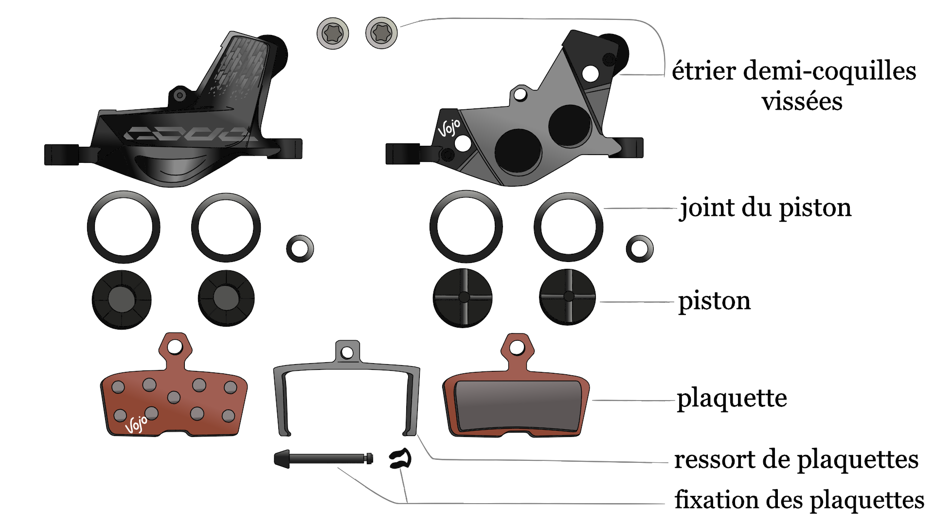 Avant de plonger réellement dans le vif du sujet, on vous propose de consulter ces deux vues éclatées, qui présentent chaque pièce qui constitue un frein. Certes, ce SRAM Code RSC ne ressemble pas exactement au Code R et encore moins à un Shimano XTR M9100. Néanmoins, le principe reste le même.