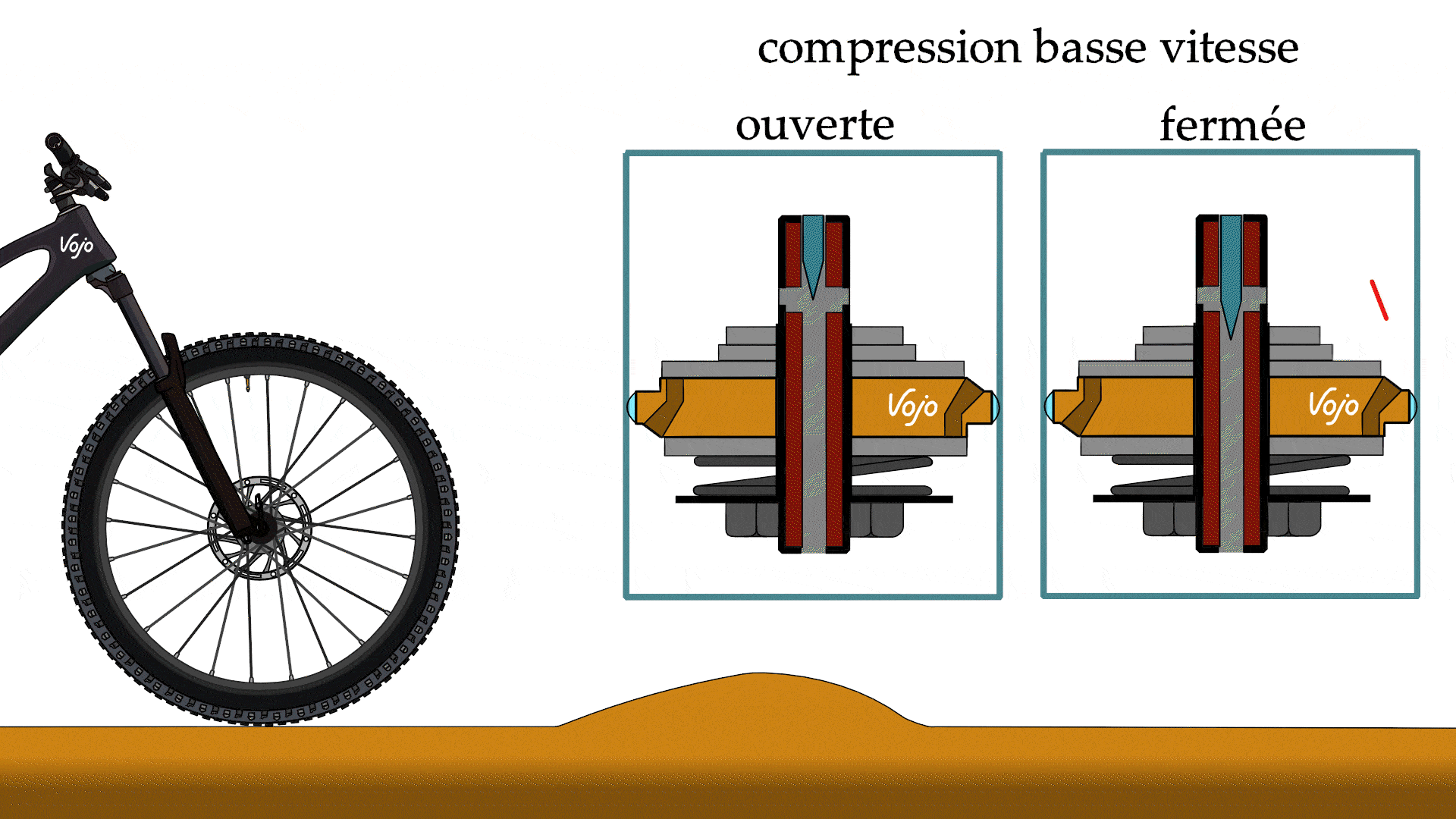 Les animations suivantes présentent le fonctionnement de la compression basse et haute vitesse, le principe est le même pour la détente (ou rebond).
