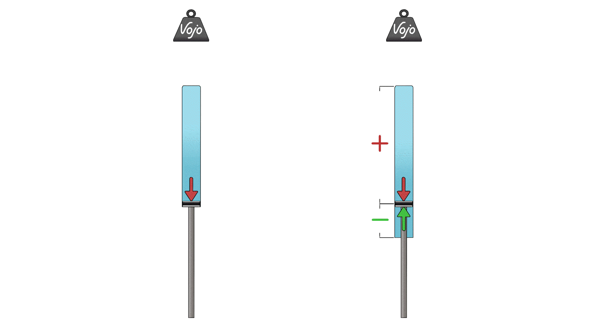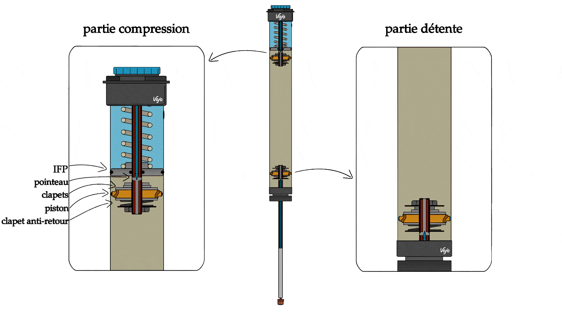 Il se compose de trois éléments distincts : la chambre positive, la chambre négative et le piston. Lorsque la fourche se comprime, comme le piston se déplace à l’intérieur du plongeur le volume de la chambre positive diminue et la pression augmente. A contrario, le volume de la chambre négative augmente donc sa pression diminue.
