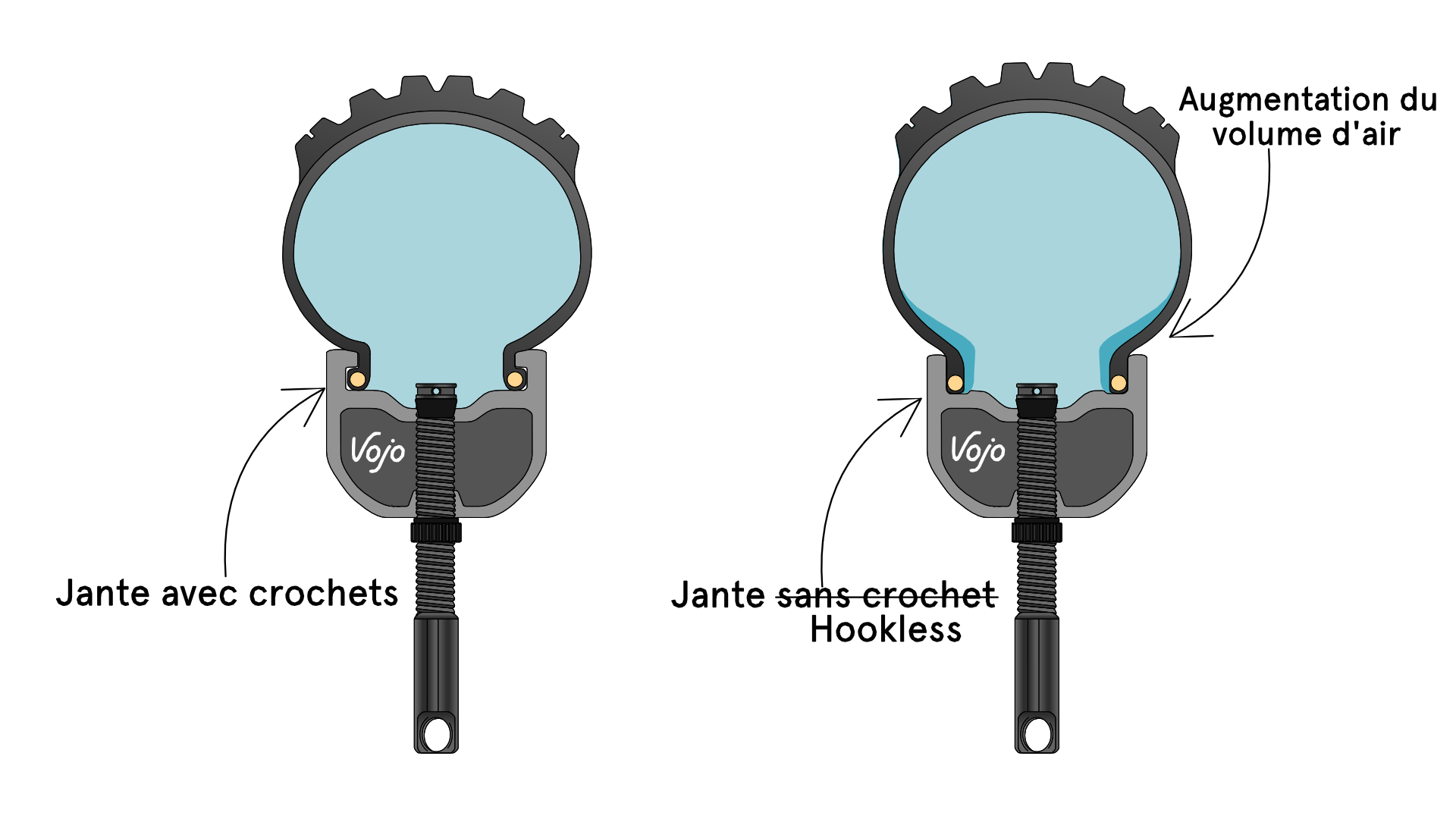 On note également une certaine augmentation du volume d’air présent dans le pneu. En théorie, pour augmenter ce volume, il faudrait augmenter la largeur de la jante et, par conséquent, augmenter la masse de l’ensemble. Or, en éliminant ces crochets, on évite d’affoler la balance, on donne une forme plus naturelle au pneu, et on s’offre le luxe de pouvoir baisser la pression. Tout cela dans l’optique d’améliorer la traction et le confort.