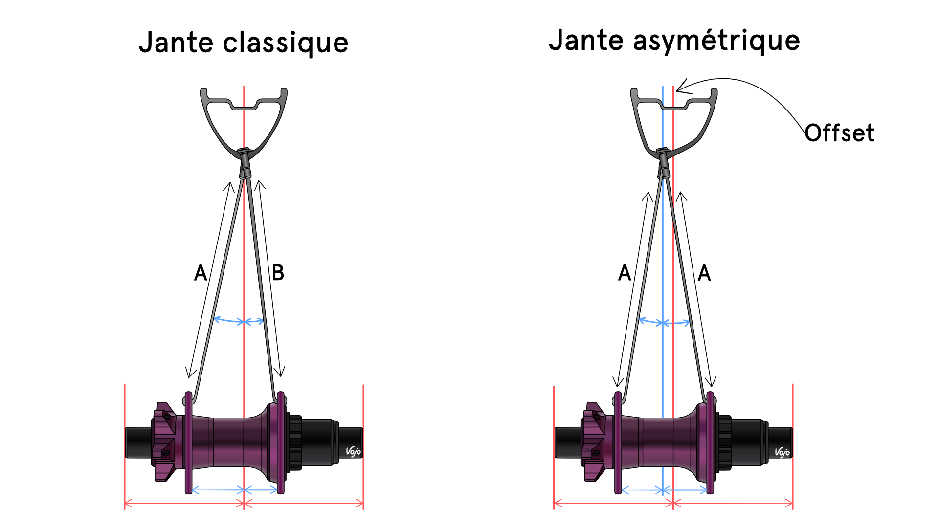 Imaginons maintenant que l’on veuille installer sur le moyeu un disque ainsi qu’une cassette pour obtenir une roue arrière moderne de VTT. La distance séparant les flasques diminue et n’est plus centrée par rapport au milieu du moyeu. L’angle formé par les rayons est alors différent et cela implique d’avoir des longueurs de rayons différentes de chaque côté. On se retrouve alors avec une tension plus importante côté transmission.