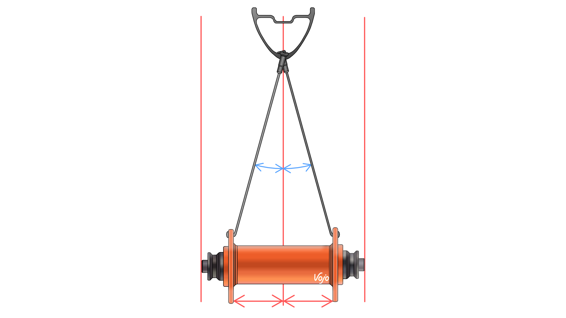 Cette différence, si elle s’avère importante, peut avoir un impact négatif sur la durée de vie de la roue. L’objectif est donc de réduire l’écart entre les angles formés par les rayons, dans l’optique de minimiser l’écart de tension entre les rayons des deux flasques.