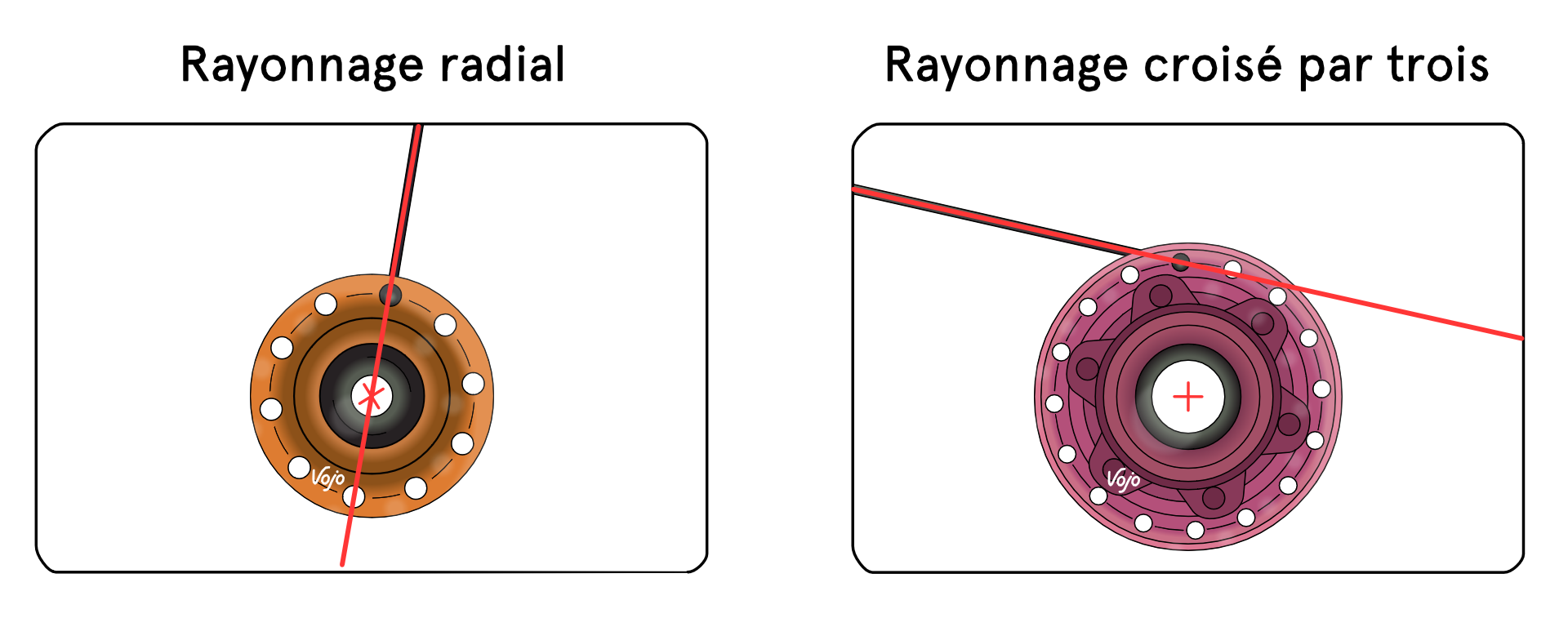 Pour comprendre cela, il nous faut dans un premier temps introduire la notion de rayon tracteur et de rayon pousseur. Ces termes s’appliquent uniquement aux roues avec un rayonnage croisé. Les roues présentant un rayonnage radial ne peuvent techniquement pas transmettre de couple. En effet, afin de transmettre un effort, l’axe suivant le prolongement de chaque rayon ne doit pas passer par le centre du moyeu. Raison pour laquelle, sur certaines roues, on compte un flasque avec des rayons croisés par deux ou par trois et un flasque avec des rayons radiaux.