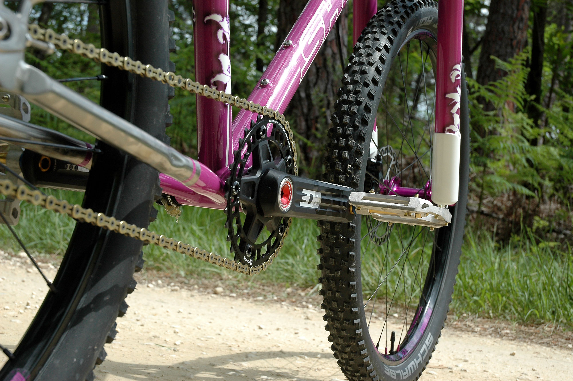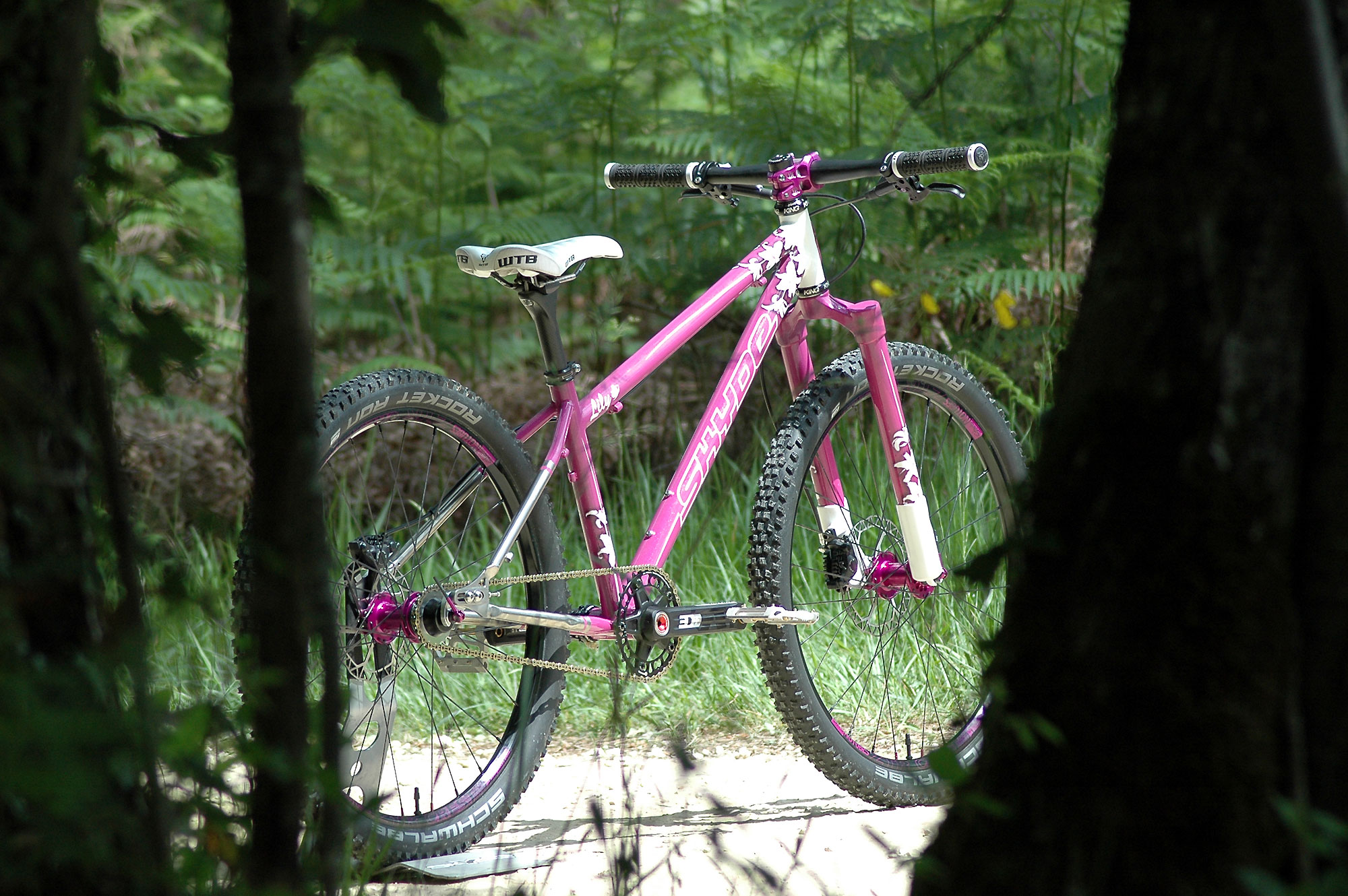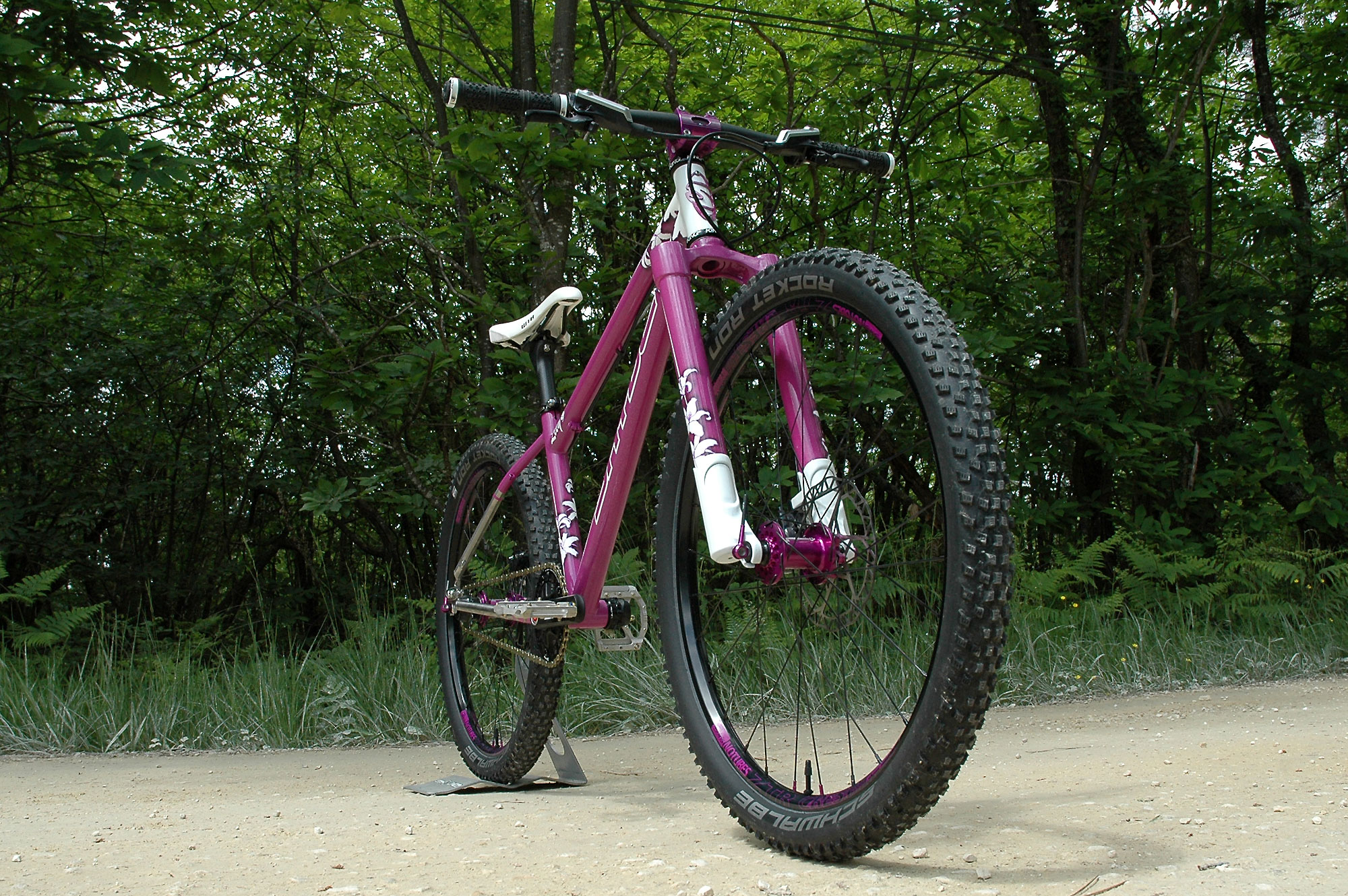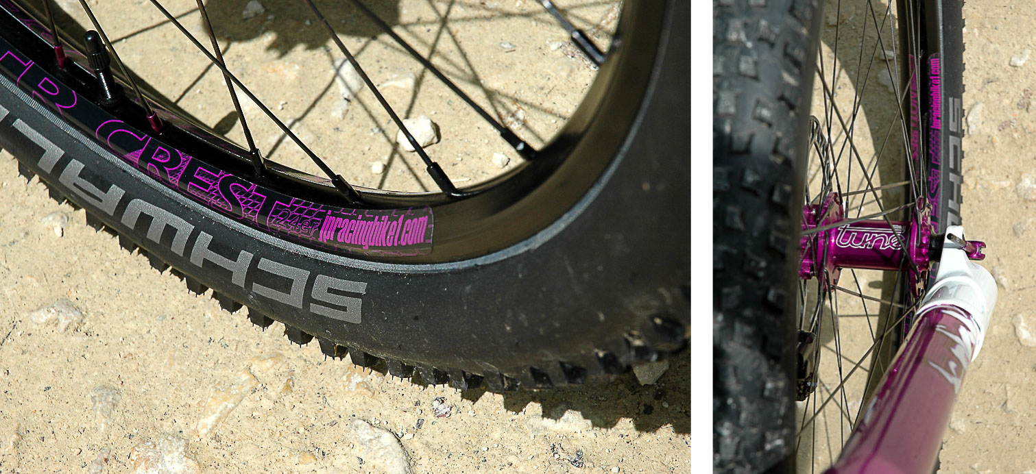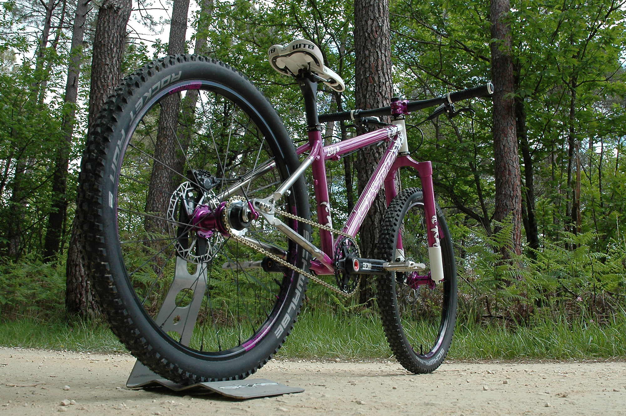 La société JPRacing m’a également bien aidé à trouver les très rares jantes ZTR Crest 24″, ce qui m’a permis de monter les roues en tubeless avec des pneus Schwalbe Rocket Ron tringles souples en 24 », eux aussi assez difficiles à trouver mais qui existent !