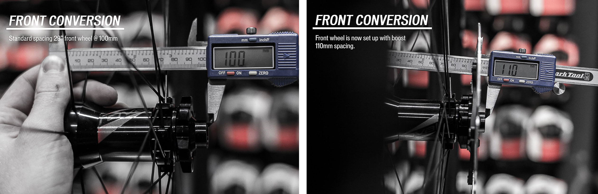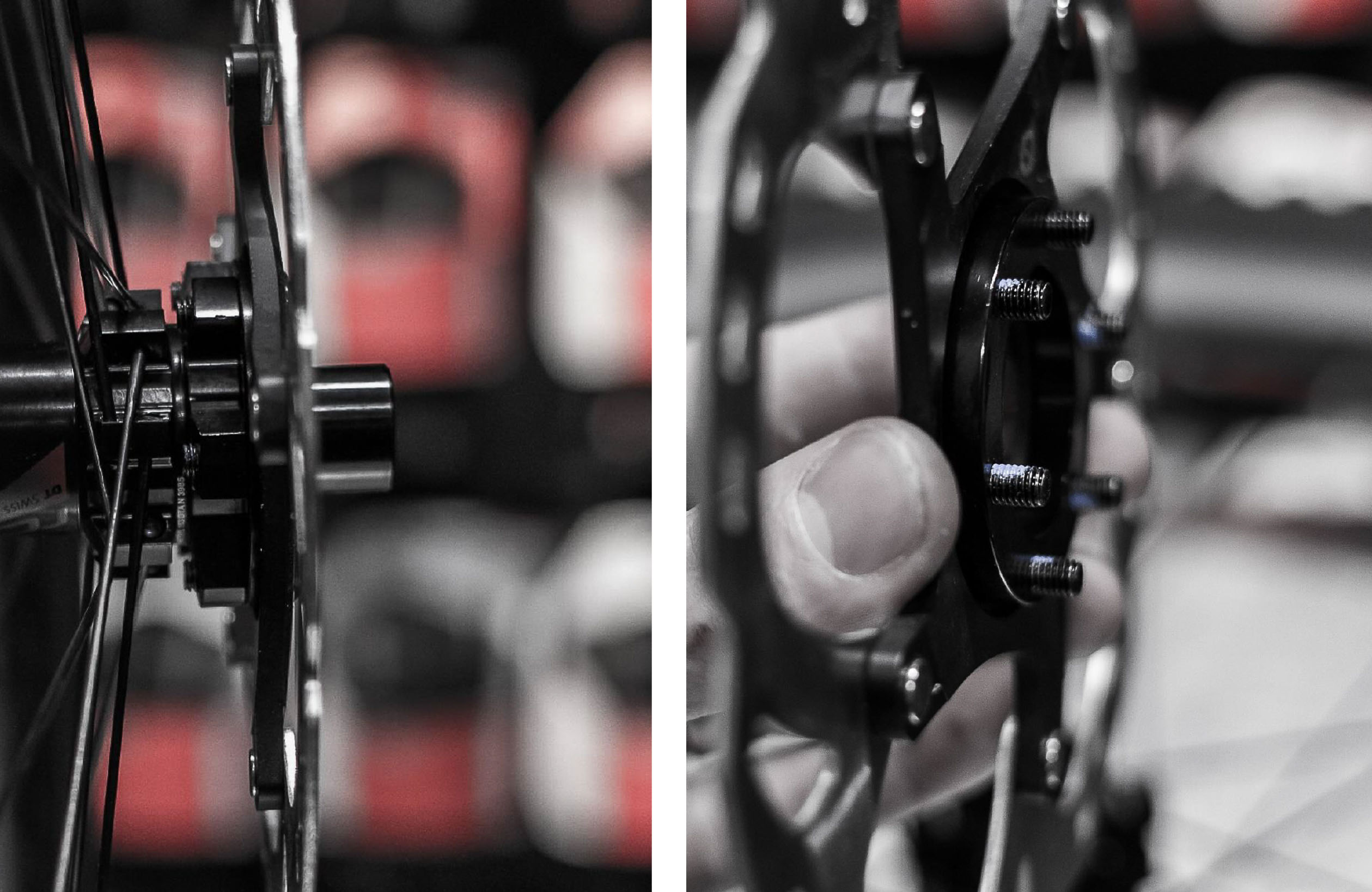 En pratique, le kit est tout simple : il est constitué d’embouts qui viennent élargir le moyeu au niveau de l’axe, de coupelles à placer derrière le disque pour le décaler de 3mm et de vis allongées pour fixer le tout sur le moyeu. A l’arrière, un petit tour de clé sera nécessaire au niveau des écrous de rayons afin de recentrer la jante par rapport au cadre. 4 kits seront proposés au prix de 54,90€ afin de convertir toutes les roues Roval 650b ou 29″ existantes.