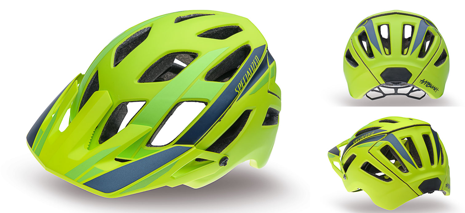 Outre les technologies déjà aperçues sur d’autres modèles de la gamme Specialized (mousse interne Aramid-Reinforced Skeleton avec mousse EPS, coque in-mold,…), on relève quelques autre détails intéressants : on le voit ci-dessus à gauche, la visière est réglable sur plusieurs positions tout en roulant pour s’adapter aux conditions (pluie, ensoleillement) ansi qu’à l’éventuel port d’un masque comme on le voit de plus en plus chez les enduristes lors de leurs sorties d’entraînement ou de plaisir ainsi qu’en liaisons. Un accent particulier a aussi été mis sur l’aération afin d’en faire un des modèles les plus respirants de la catégorie. Au-delà du nombre des ouvertures qui, dans l’absolu, ne veut pas dire grand chose, c’est surtout la taille des évents qui a été travaillée sur l’Ambush, ainsi que la circulation d’air à l’intérieur du casque via l’alignement des orifices pour assurer une bonne ventilation. C’est ce que Specialized appelle le « refroidissement 4th Dimension ». Les mousses internes sont aussi dotées de canaux qui permettent d’évacuer la sueur des yeux. Un détail intéressant que nous avons hâte de tester tant ce phénomène peut être dérangeant quand il fait chaud !