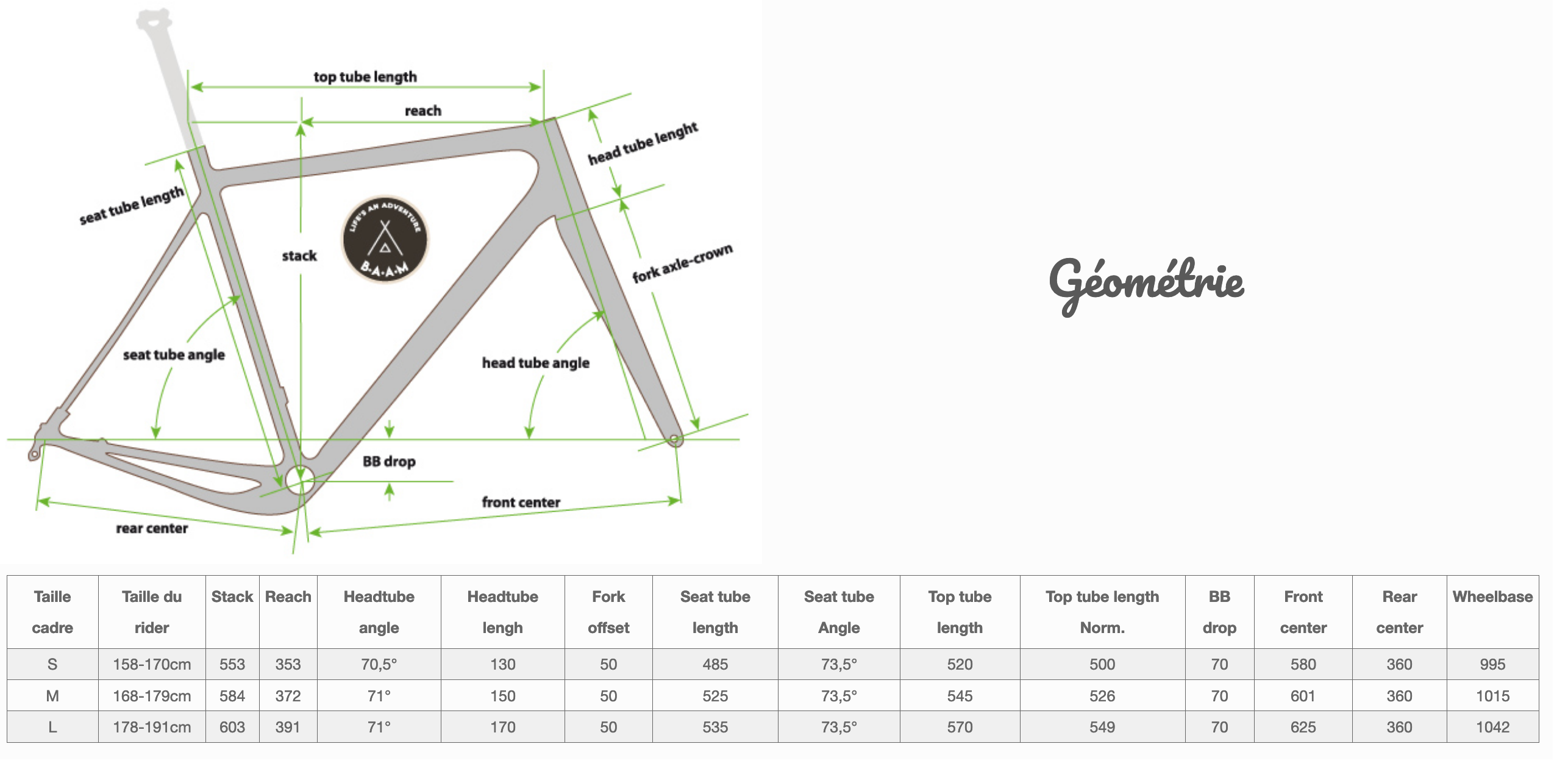 Côté géométrie, le Baam Argh se décline en trois tailles : S, M et L. Par rapport au reste du marché, le vélo semble toutefois particulièrement court tant de l’avant que de l’arrière et le M se rapproche beaucoup d’une taille 52 ailleurs.