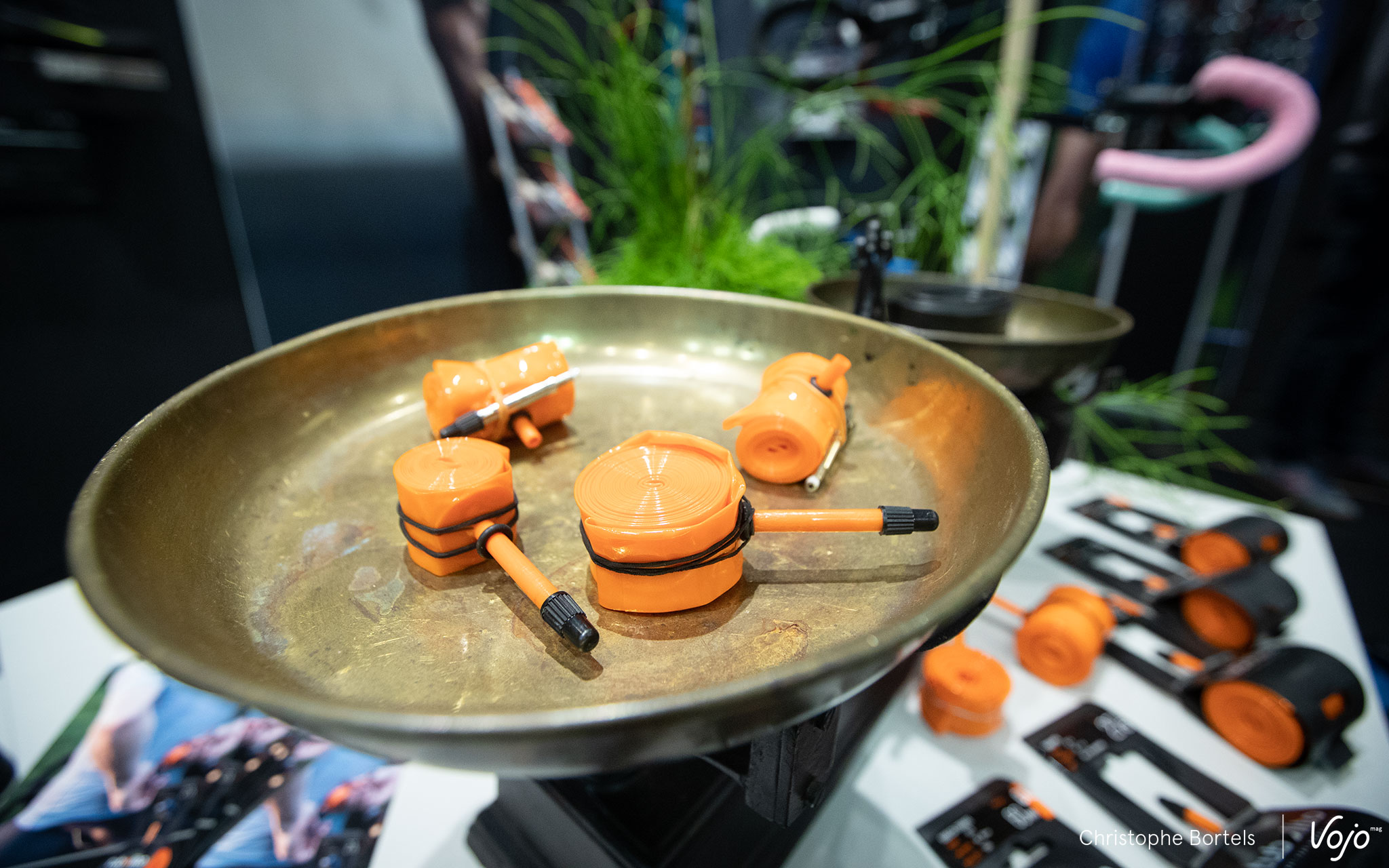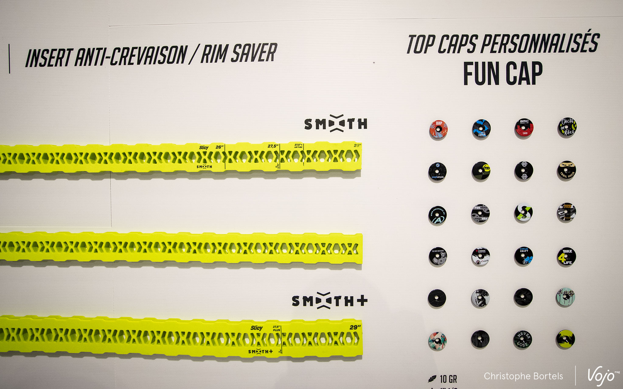Sur le stand de Slicy, en plus des garde-boue, on pouvait découvrir les fameux top caps personnalisables, mais aussi les futurs inserts pour pneus.