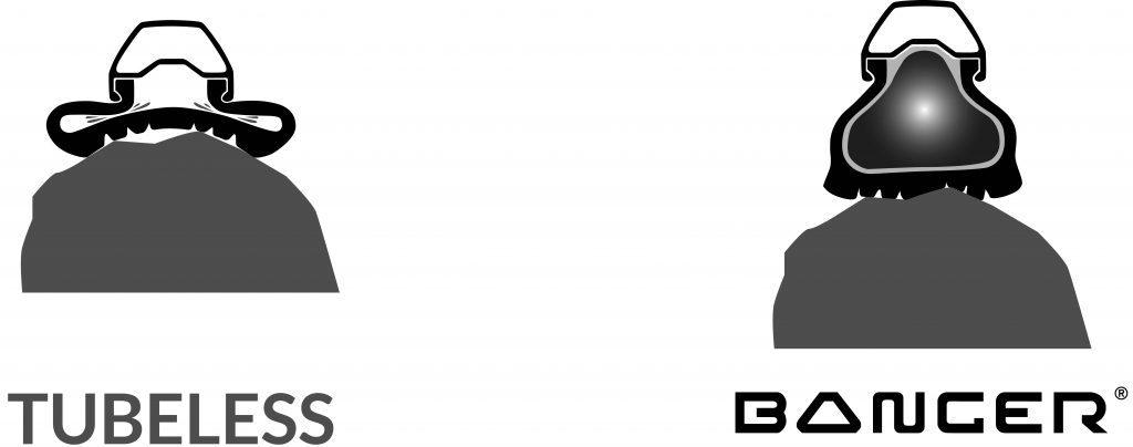 Concrètement, le Banger est un « boudin » réalisé dans un matériau polymère à très faible densité qui peut-être installé avec n’importe quel ensemble jante/pneu tubeless-ready du marché. Il remplace à peu près 95% de l’air contenu dans un pneu de section 2.0… mais il en reste donc un tout petit peu. Cela permet de conserver des sensations comparables avec celles d’un pneu classique et d’adapter la pression selon le poids du pilote, le terrain ou le type de pneu utilisé.