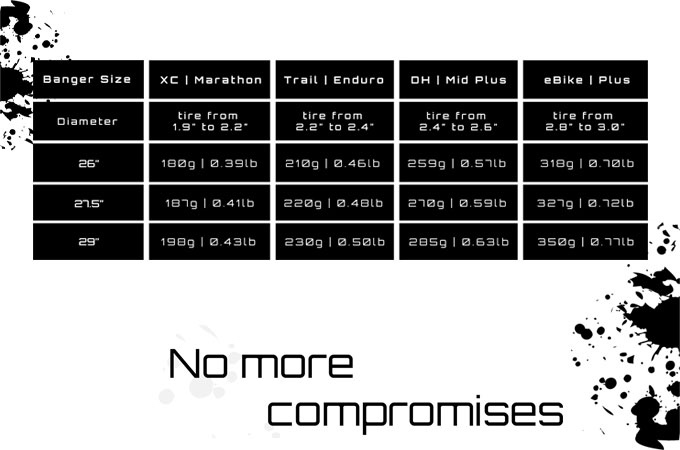 Le Banger by MrWolf a une densité faible et ne pèse que 0,046g/cm3. Le principe se rapproche des systèmes bien connus dans la moto, mais qui utilisent des composants bien plus denses ; les masses n’étant pas du tout les mêmes. Le Banger pèse 198g par roue en version 29″ XC. Il est disponible en trois diamètres (26, 27,5 et 29 pouces) ainsi qu’en différentes largeurs pour s’adapter à différents types de pneus et de pratiques.