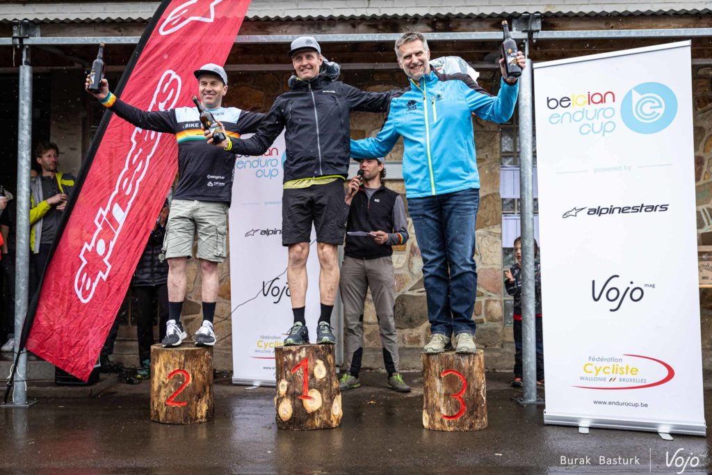 En e-bike, Maxime Lichtken l’emporte en surclassement, avec un temps qui le placerait en 4e position scratch et avec plus d’une minute d’avance sur Patric Maes, son plus proche poursuivant (qui l’emporte en Masters – absent sur le podium à droite) !