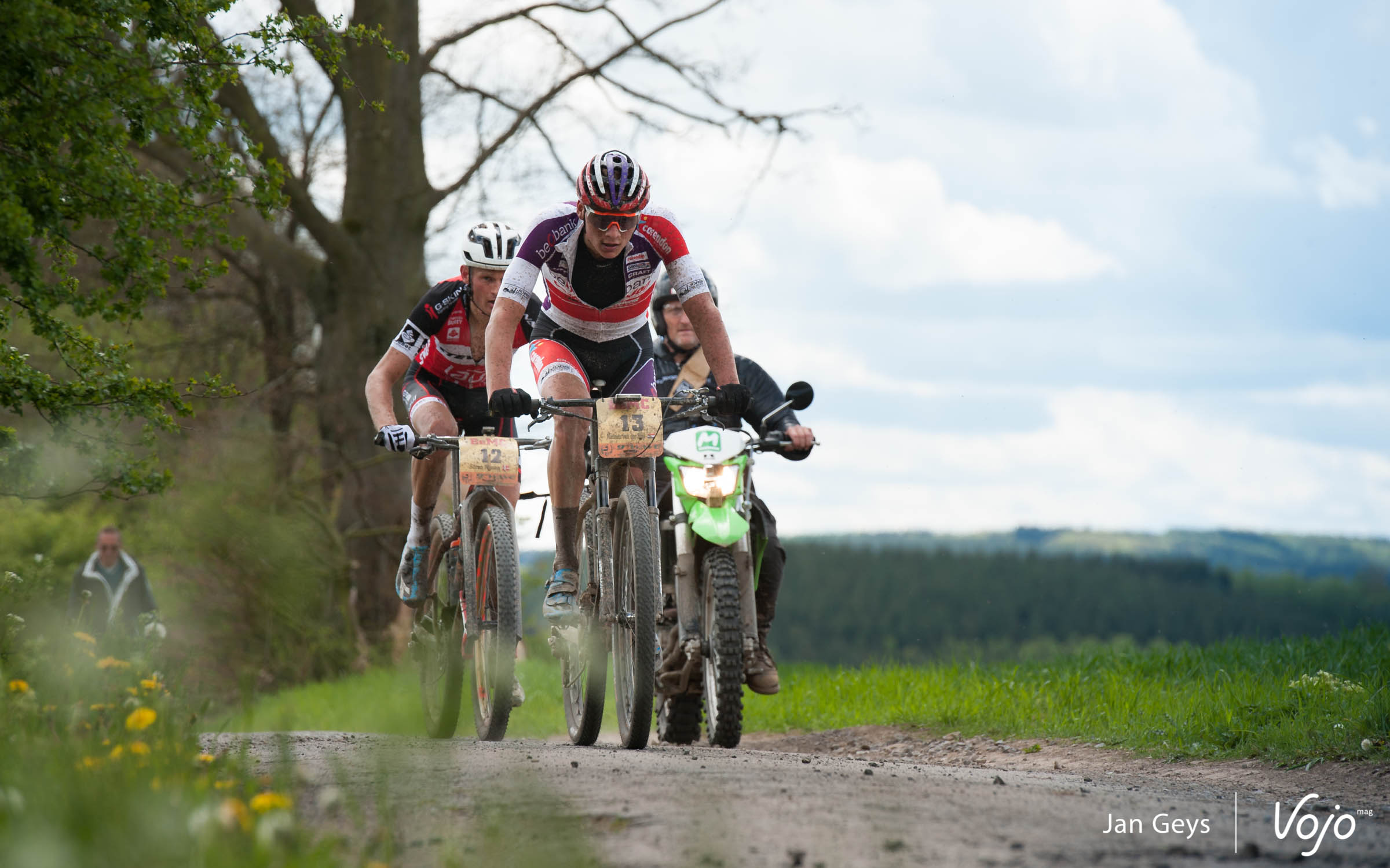 Maarten Wynants (pro sur route, qui prépare actuellement le Tour de France et qu’on voit beaucoup sur un VTT en ce début de saison), Wietse Bosmans (coéquipier de Mathieu VDP) et Piriklis Ilias (ancien champion du Monde de marathon) éliminés sur pépins mécaniques, Mathieu van der Poel s’est retrouvé seul en chasse du duo de tête.