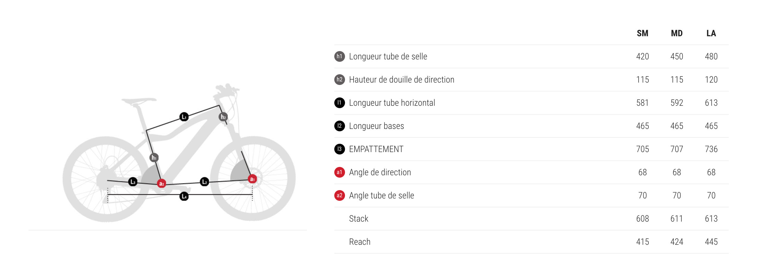 Trois tailles sont au programme, S, M et L, avec une géométrie qui s’inscrit dans la lignée des fulls suspendus all-mountain de la marque. Rien d’extrême, mais des valeurs cohérentes sur le créneau avec notamment un angle de 67° sur le Lynx 6 et 68° sur le Lynx 5 Atom X, ainsi qu’un Reach de 424mm en M et 445mm en L. L’angle de tube de selle à 70° étonne par contre (habituellement on est plutôt entre 73 et 76°) mais il s’agit sans doute soit d’une erreur, soit d’une mesure de l’angle virtuel et non réel.