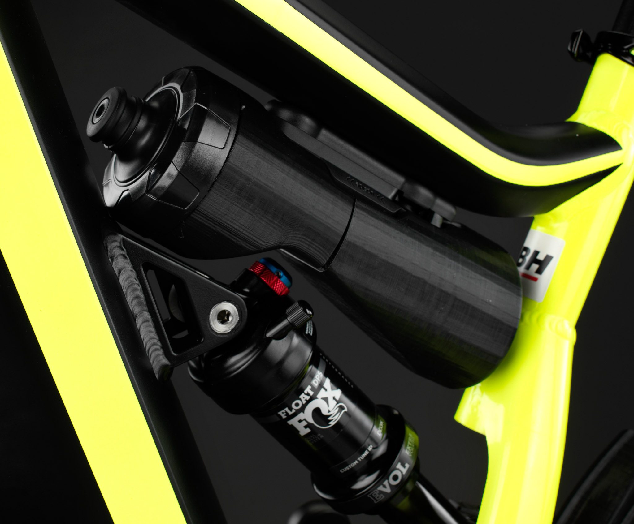 Dans le petit espace laissé libre entre ce dernier et le tube supérieur, on remarque que BH a trouvé moyen de loger un bidon. D’une forme spécifique, il utilise le système aimanté FidLock qui permet de le retirer latéralement. Il y a également une petite trappe au-dessus du boîtier de pédalier pour y glisser un nécessaire de réparation (dans une housse, fournie, pour éviter les vibrations).
