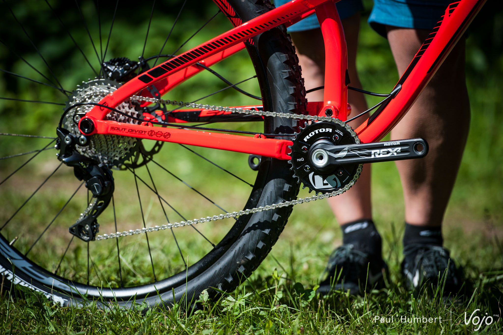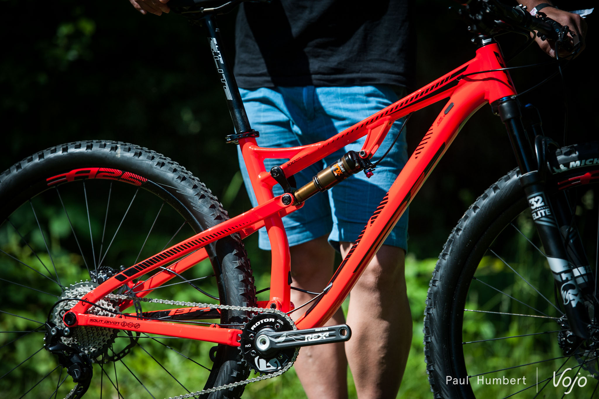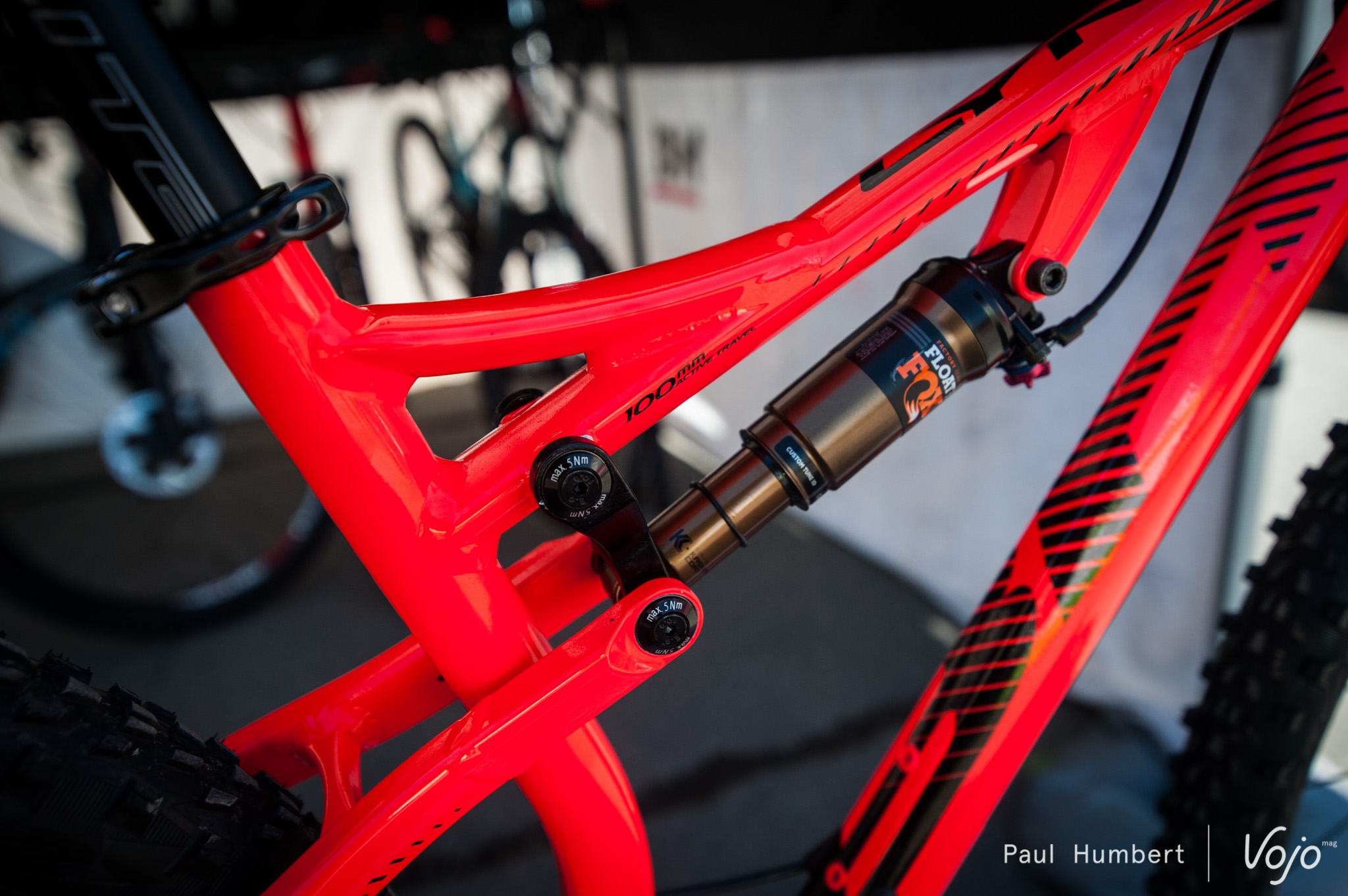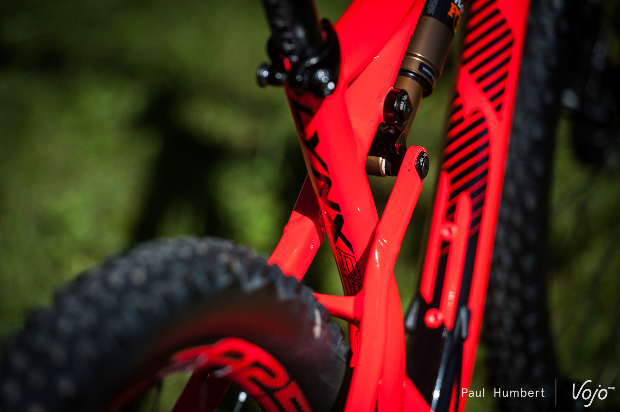 La cinématique de la suspension reste un « Split Pivot » et continue à offrir une très grande progressivité. Toutefois, on l’a dit, la position de l’amortisseur change et se retrouve parallèle au tube supérieur. L’objectif était d’obtenir une ligne plus racée en utilisant une toute petit biellette (95g en alu, beaucoup moins sur le futur carbone).