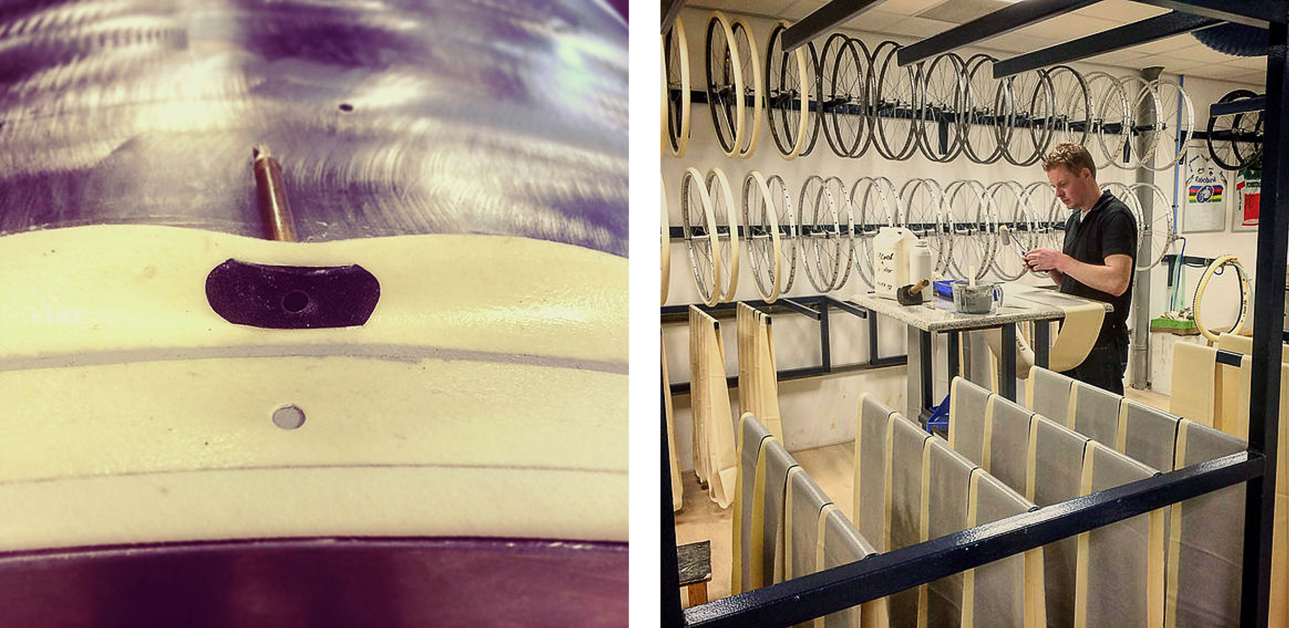 Cela ne se voit pas dans la mesure où un boyau est une enveloppe fermée, mais ce type de bande de roulement renferme une chambre à air à l’intérieur du tube (ici en coton) sur lequel est collée la chape. Si le boyau est très peu sensible aux crevaisons par pincement dans la mesure où il est collé sur une jante au profil plat, sans crochets, il reste sensible aux épines ainsi qu’aux déchirures. « Nous étions aussi persuadés qu’il était possible de faire encore mieux en accroche et en confort en retirant la chambre à air », explique Richard Nieuwhuis. Ce procédé, déjà appliqué par Tufo notamment, n’avait cependant jamais été mis en place sur des boyaux haut de gamme en coton.