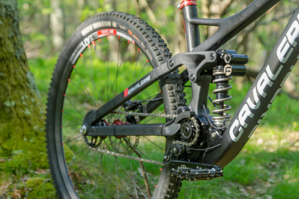 Cavalerie a reçu l’aide d’Alex Guiral d’Antidote Solutions pour développer la cinématique avec un point de pivot haut, un choix technique que l’on retrouve de plus en plus en fréquemment sur les vélos destinés à engager dans la pente. D’après David Rouméas, cela leur permet d’obtenir une suspension plus sensible qu’à l’accoutumée tout en profitant de la tension de la chaîne pour réduire le pompage de la suspension.