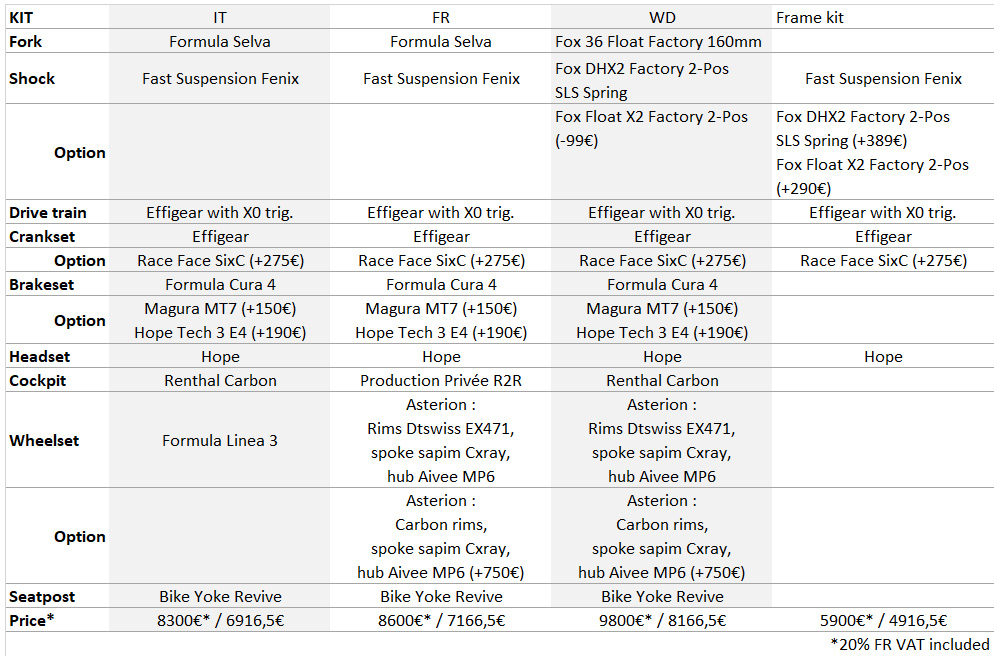 Cavalerie propose 3 montages entre 8 300 € et 9 800 € ainsi qu’un kit cadre + amortisseur + boîte de vitesse à 5 900 €. Certes, les tarifs sont élevés mais pour ce prix vous disposerez d’un cadre exclusif et entièrement réalisé en France, quelque chose qui n’est pas si courant quand on parle de carbone…