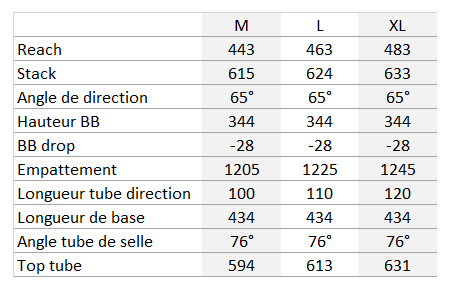 La géométrie se situe dans la moyenne du secteur avec notamment des bases de 434 mm, un reach à 443 mm en taille M et un angle de direction de 65°.