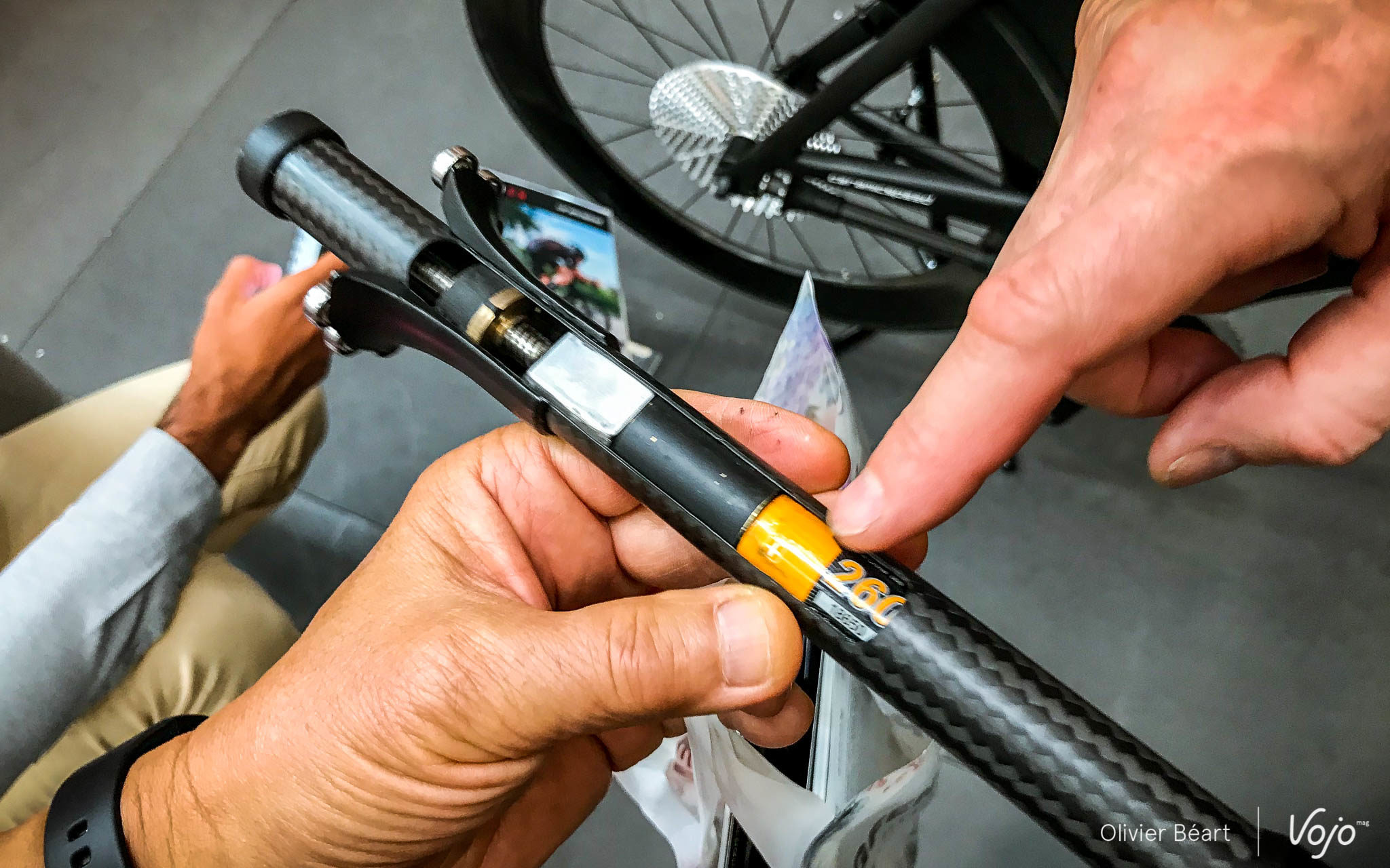 Le changement de vitesses se fait, lui, via un mécanisme caché dans l’arbre de transmission. Celui-ci n’est pas encore au point et le modèle présenté à l’Eurobike n’était pas fonctionnel, mais le principe repose sur un servo-moteur géré électroniquement et une petite batterie rechargeable qui va faire bouger la tête de l’arbre pour la placer sur le rapport souhaité. La communication avec la commande au guidon se fait via Bluetooth.