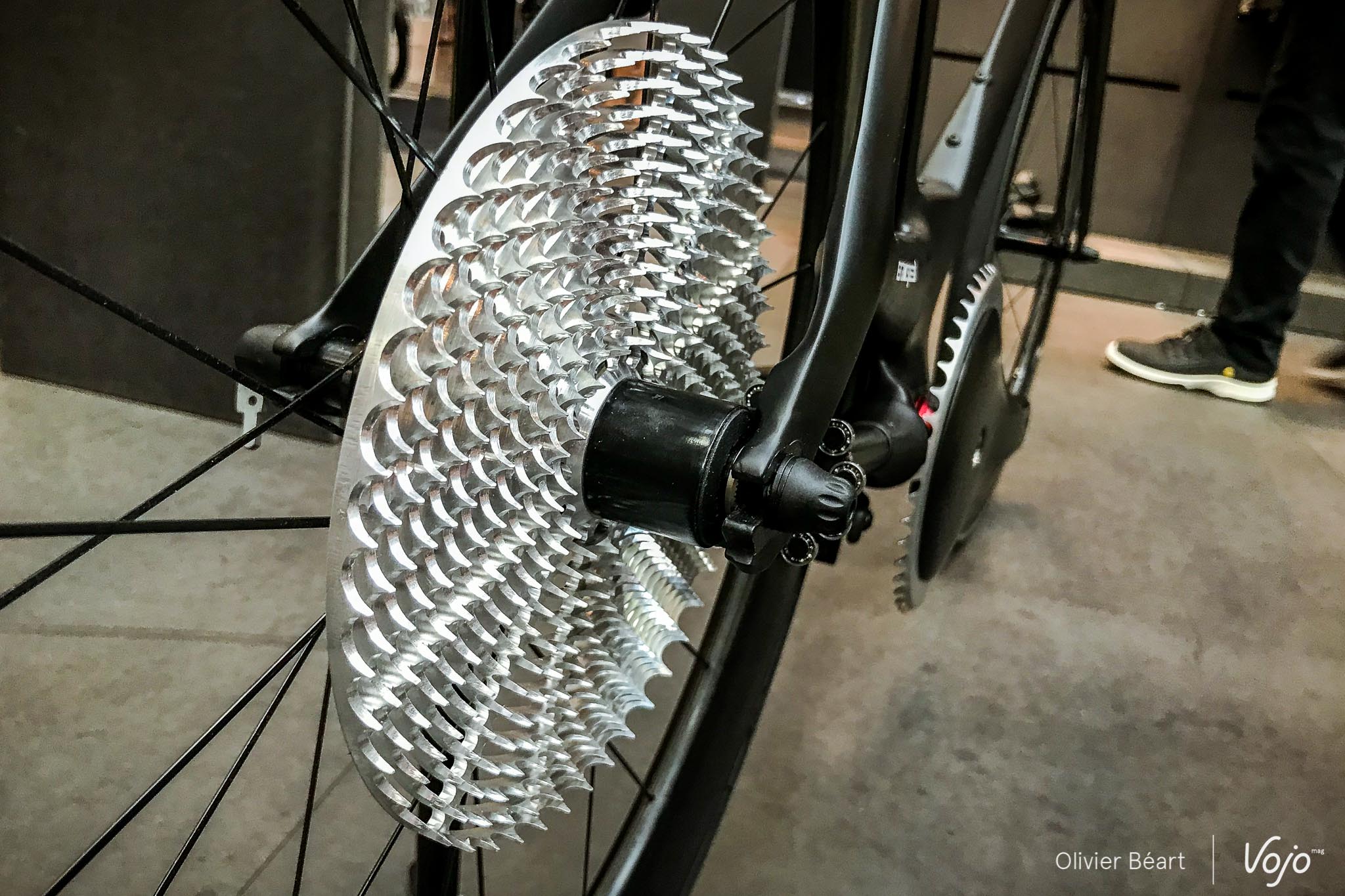 Quant à la cassette, elle mérite qu’on s’y attarde car elle est… complètement plate ! La tête de l’arbre se déplace longitudinalement sur les rapports de la cassette, qui en compte actuellement 13 sur ce concept. « Mais si on le souhaite, on peut en mettre bien plus. Théoriquement, on pourrait en mettre jusqu’à la jante et avoir jusqu’à 25 ou 30 vitesses, voire plus. Bon, cela n’aurait pas vraiment de sens mais cela montre que le concept permet beaucoup plus de libertés qu’une transmission conventionnelle », explique le responsable de la marque.