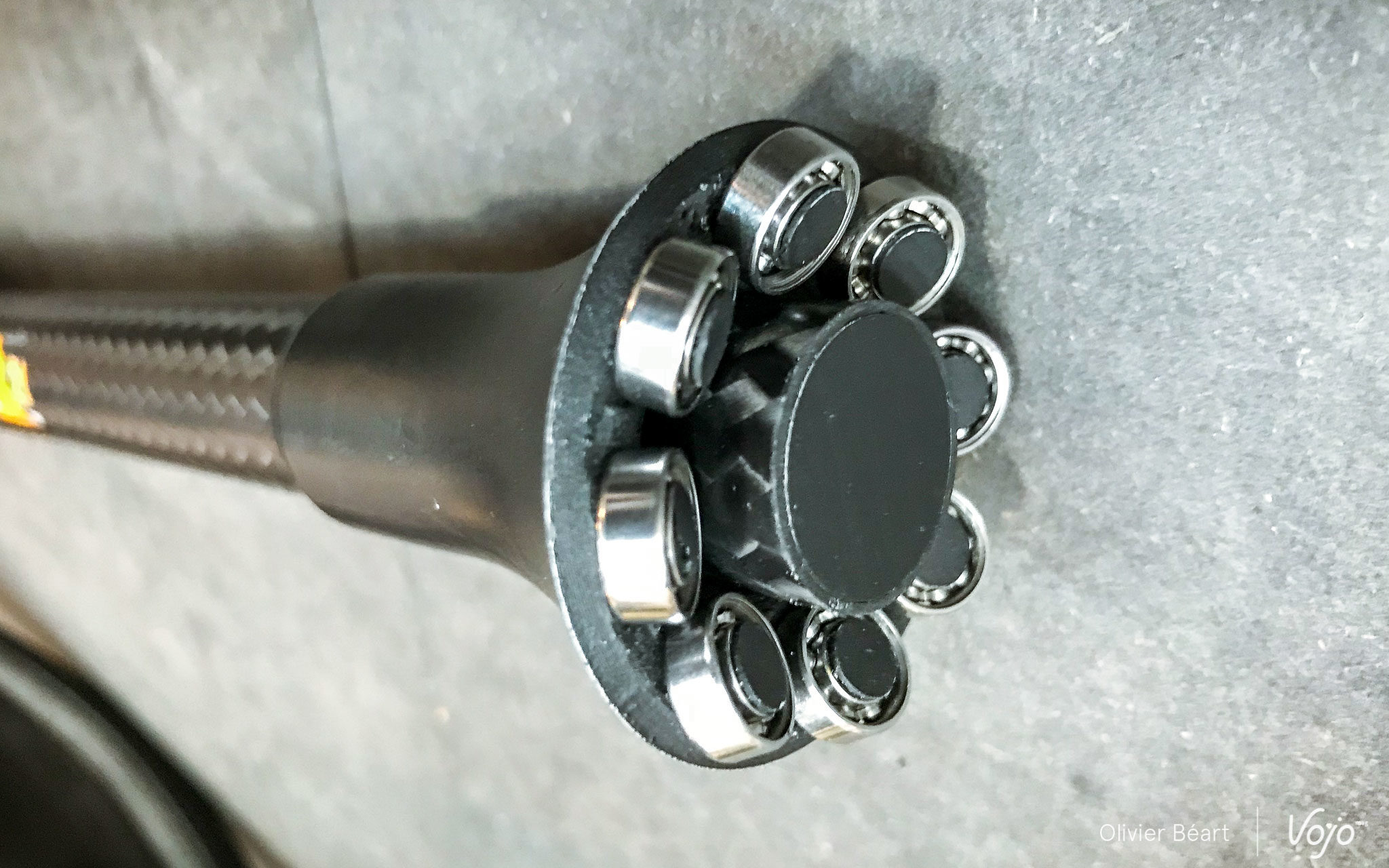 Tout d’abord, les extrémités de l’arbre de transmission sont équipées de petits roulements qui permettent de réduire les frottements avec les dents du plateau et de la cassette. On remarque que ces dernières ont une forme très particulière. Sur le plateau, elles sont courbées telles des griffes.